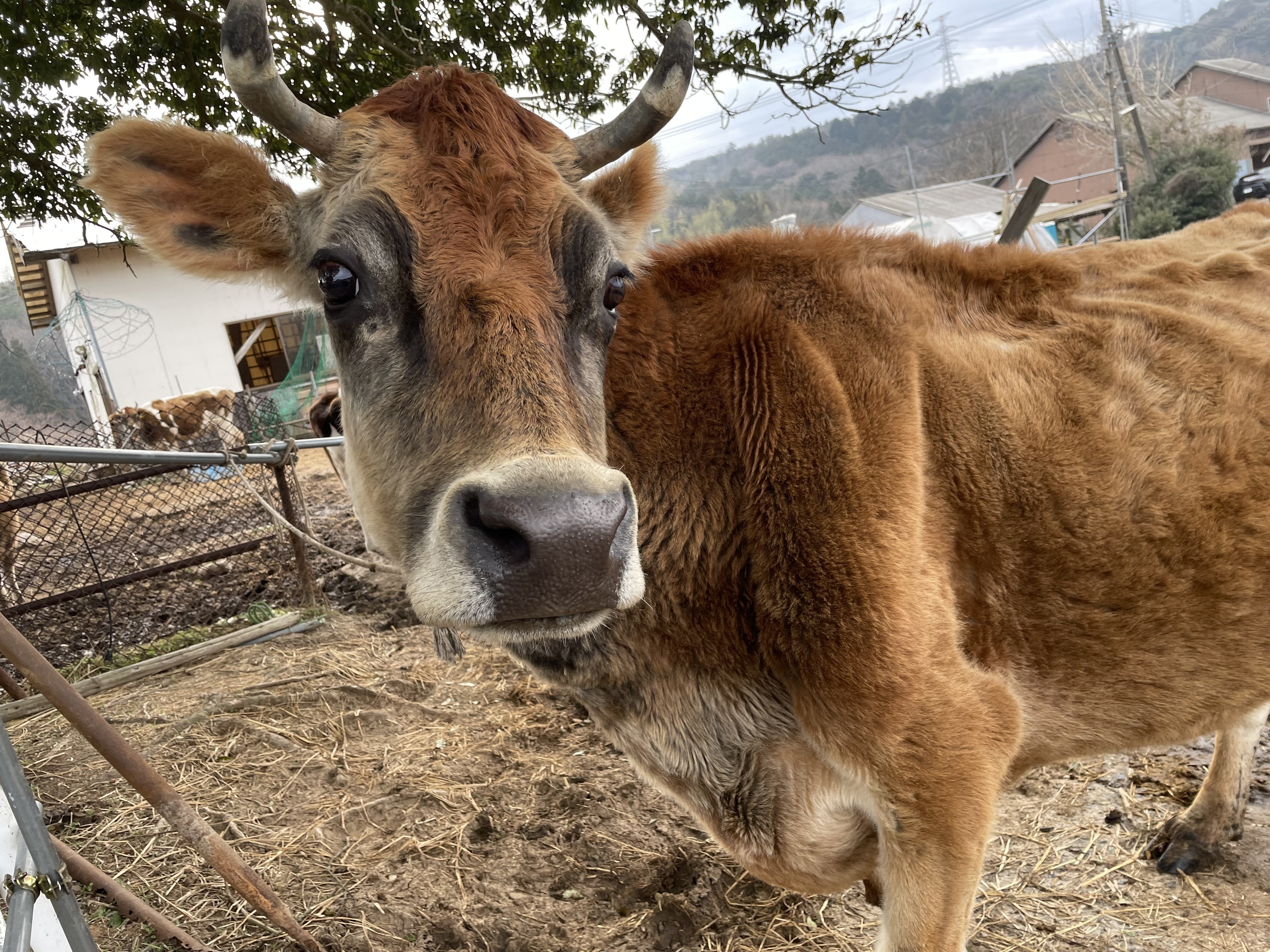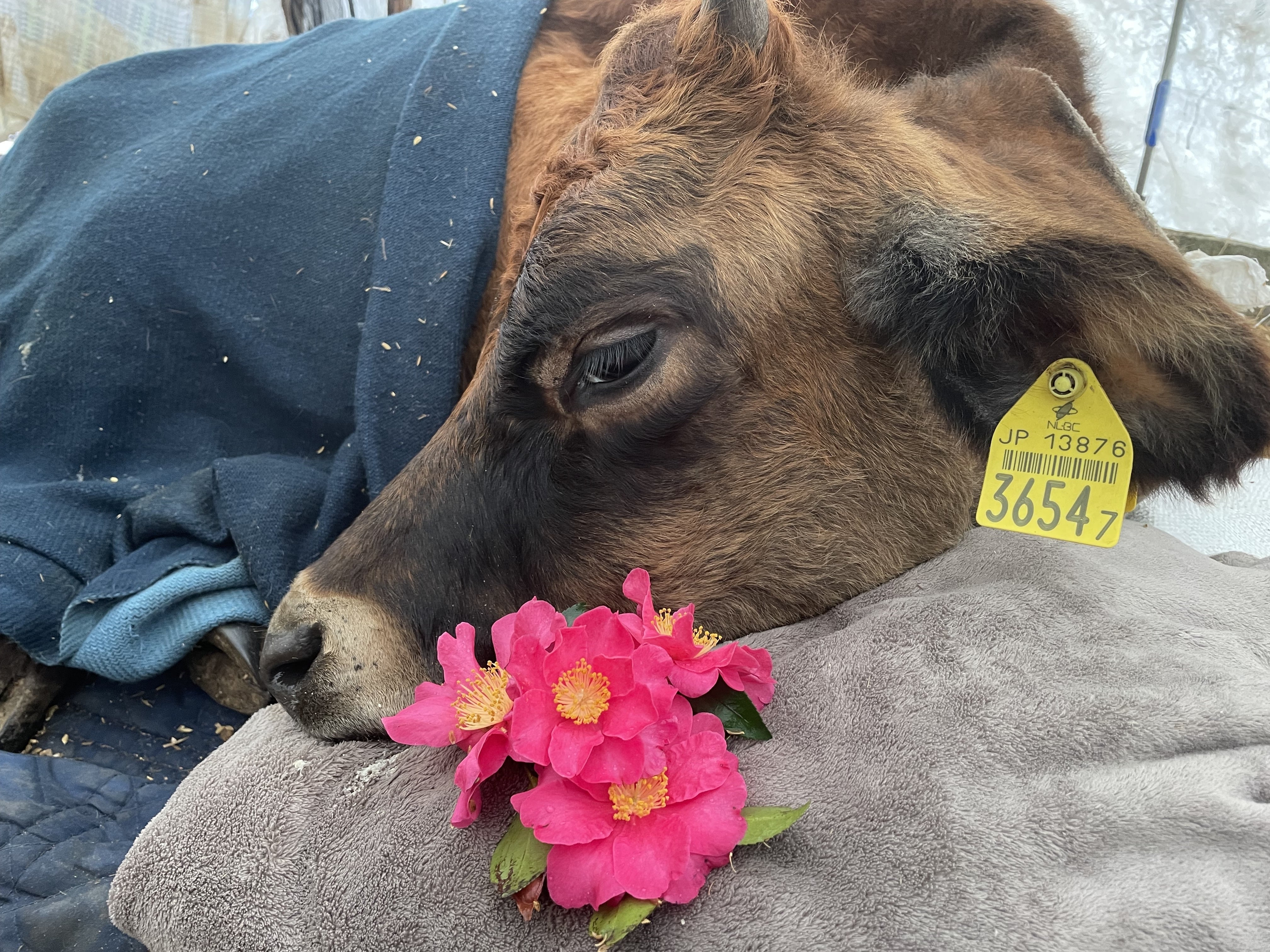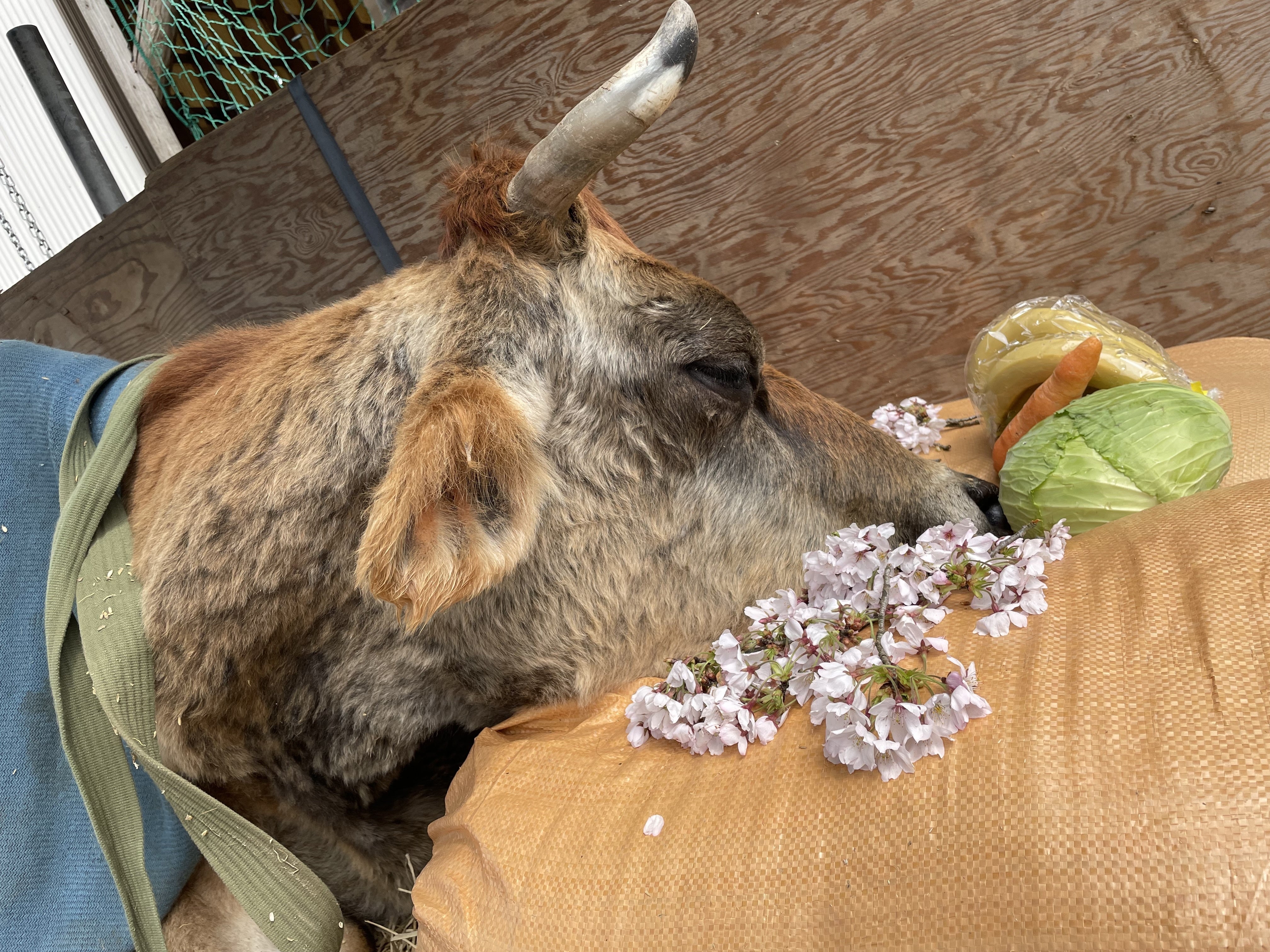 にこは、前回の報告から脚は回復し、元気に生活していましたが、3月の半ば、柵の間から顔を出した時に角が引っかかってしまい、角が抜けた拍子に転んでしまいました。転んだ場所がぬかるみであったため、人力では起こしてやる事がすぐにはできず、何時間もかけて榮元さんとりさちゃんと3人でチェーンブロックを使いながら起こしてからの場所移動でした。その間に体力の消耗もあったと思います。チェーンブロックだけでは牛舎の中に入れてやる事ができず、畳を敷きテントを立てて、その中での介護となりました。外での介護は厳しく、つり上げで腹部マッサージも毎日していましたが、次第に鼓脹症の症状が強くなり、それが原因で亡くなってしまいました。Feel at homeでは最年長の10歳でした。