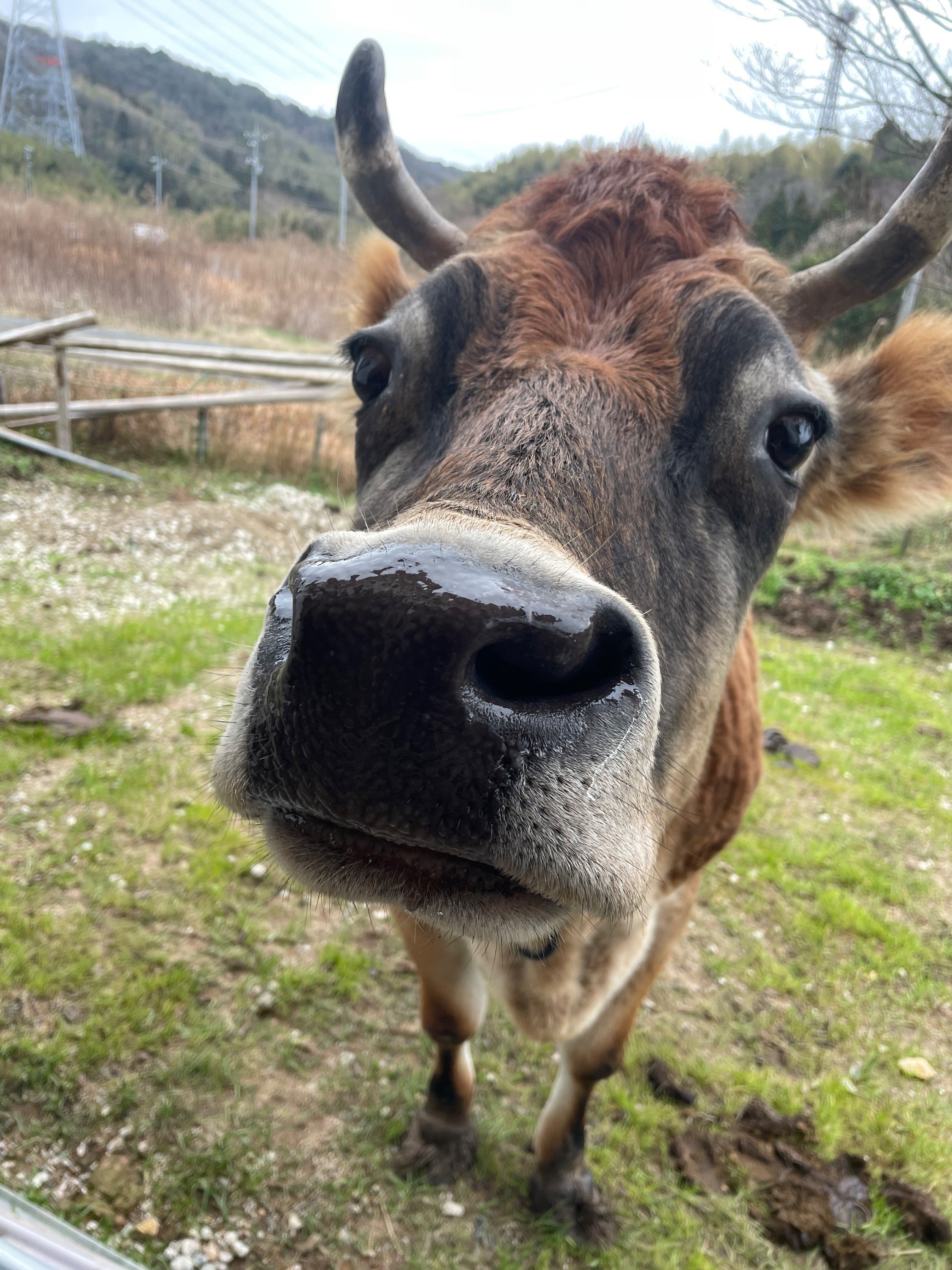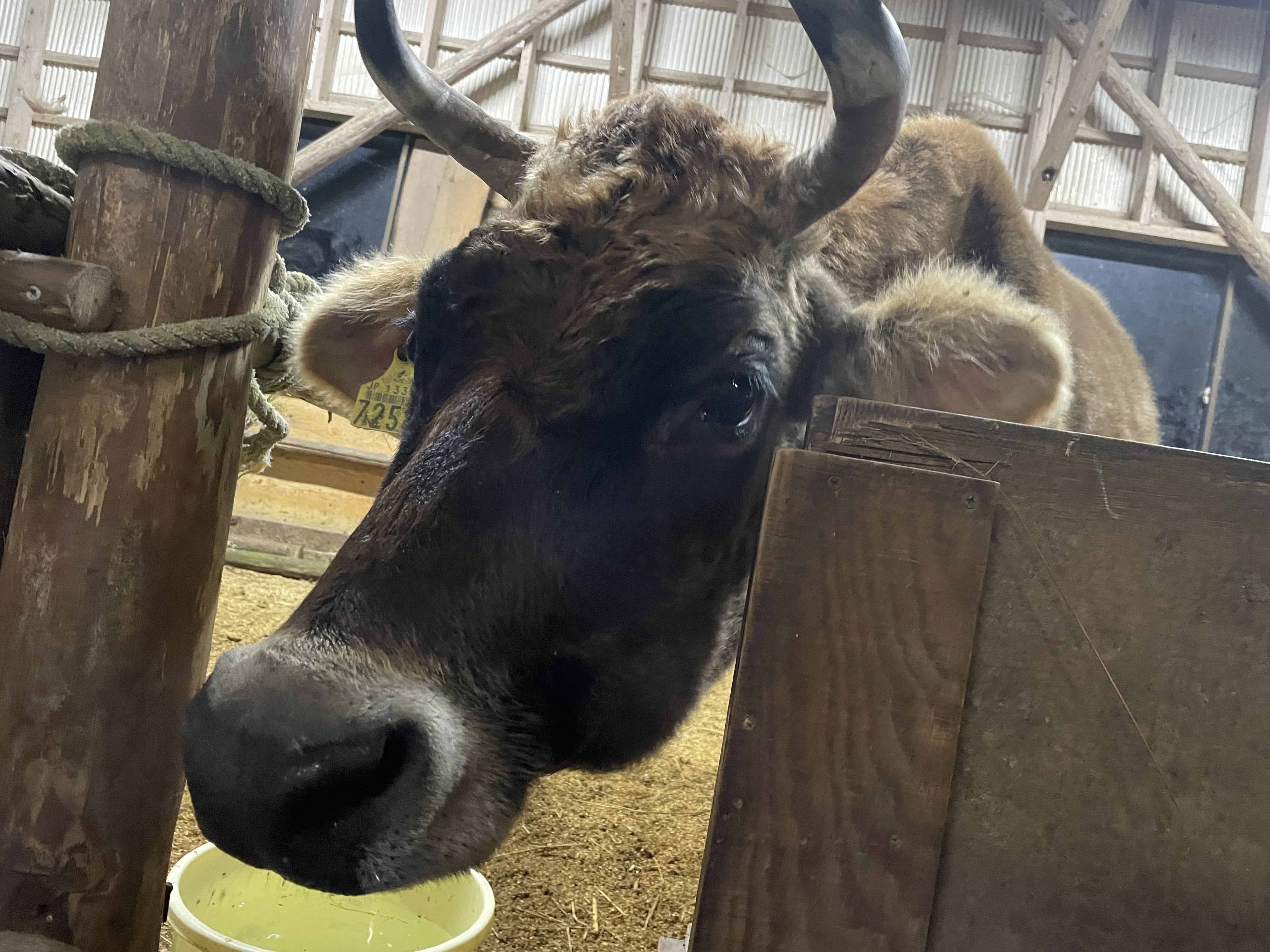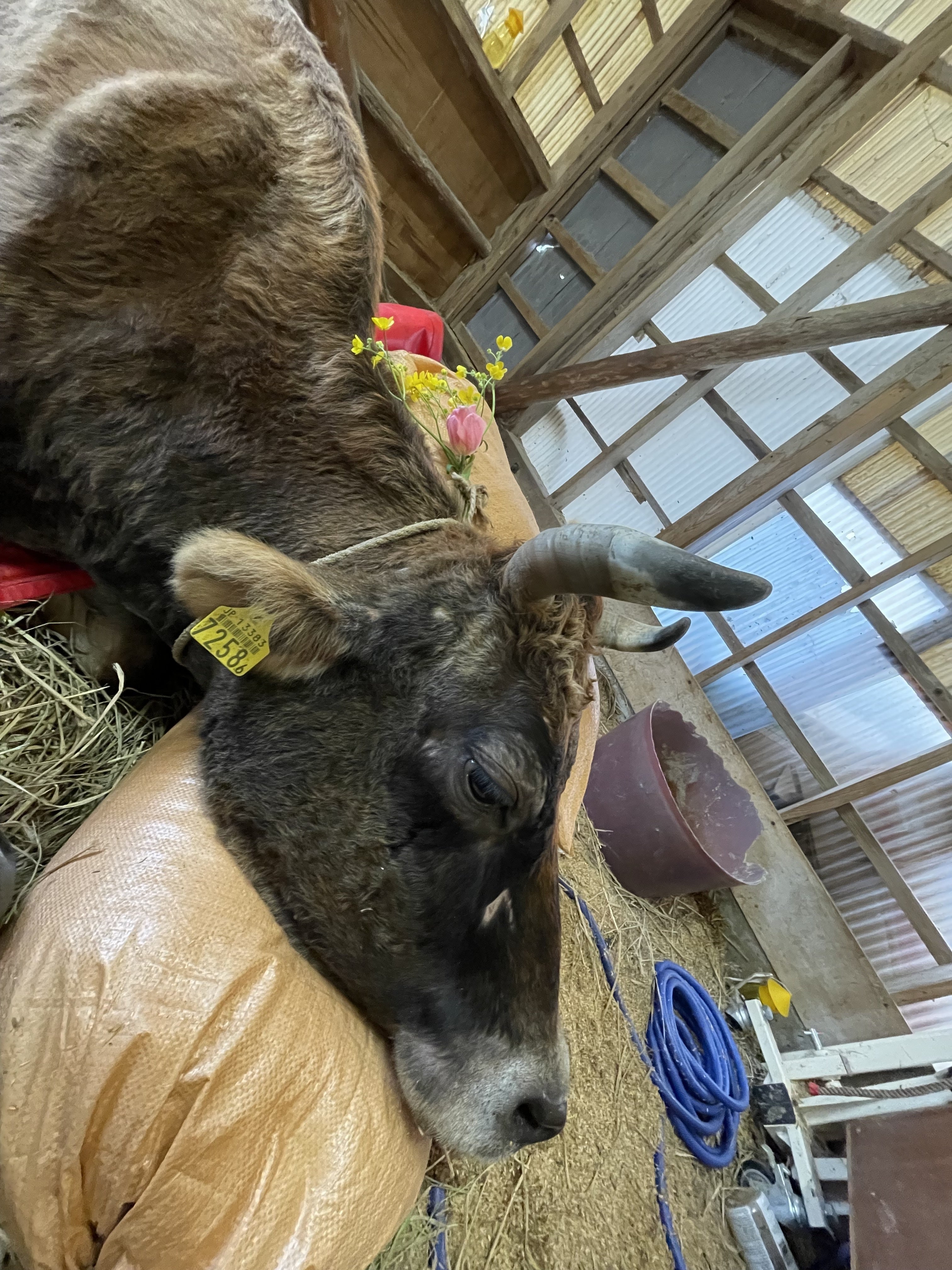 にこは、前回の報告から脚は回復し、元気に生活していましたが、3月の半ば、柵の間から顔を出した時に角が引っかかってしまい、角が抜けた拍子に転んでしまいました。転んだ場所がぬかるみであったため、人力では起こしてやる事がすぐにはできず、何時間もかけて榮元さんとりさちゃんと3人でチェーンブロックを使いながら起こしてからの場所移動でした。その間に体力の消耗もあったと思います。チェーンブロックだけでは牛舎の中に入れてやる事ができず、畳を敷きテントを立てて、その中での介護となりました。外での介護は厳しく、つり上げで腹部マッサージも毎日していましたが、次第に鼓脹症の症状が強くなり、それが原因で亡くなってしまいました。Feel at homeでは最年長の10歳でした。