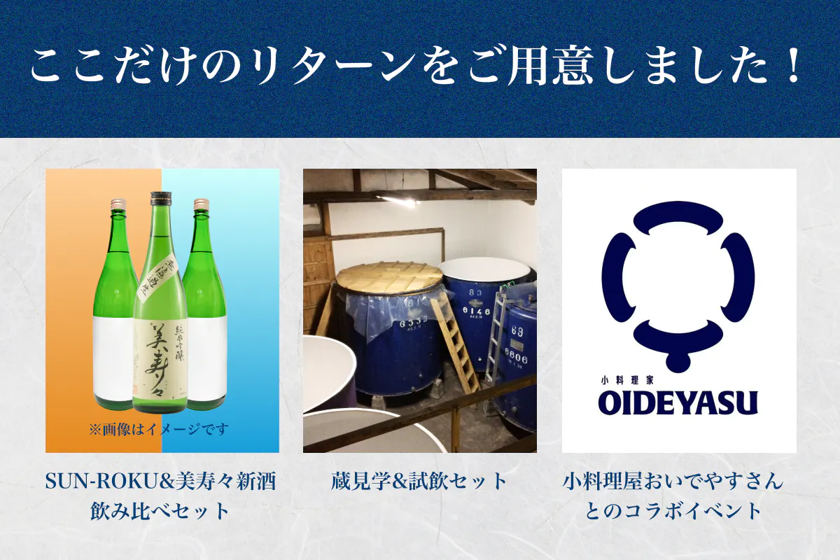 火入れ・生酒のセットに美寿々の新酒を加えた飲み比べセットや、蔵見学&試飲セット、おいでやすさんとのイベント!?など複数のリターンを用意しています! 是非ご覧ください!