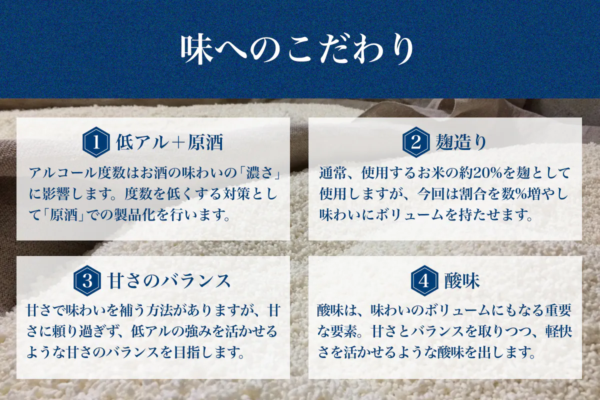 その狙いは、麹の使用量を増やすことで味わいにボリュームを持たせることです。低アルで物足りなさを感じさせないための対策です。