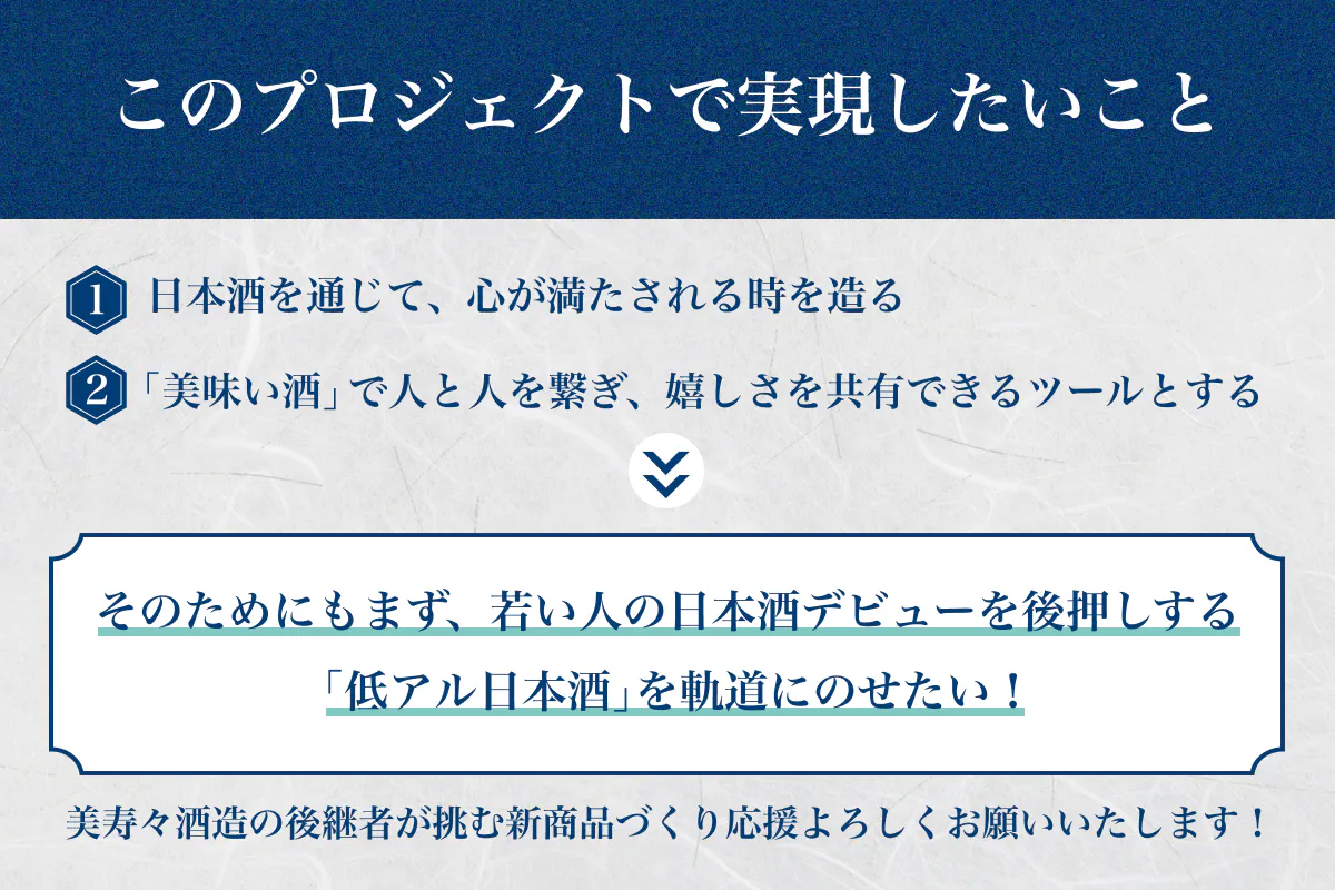 美寿々酒造として低アル原酒は初の試みで挑戦的な面もありますが、いい意味で日本酒らしくない低アル原酒で、皆さんが日本酒に踏み込んでいけるきっかけのお酒になれるように精一杯やらせていただきます!