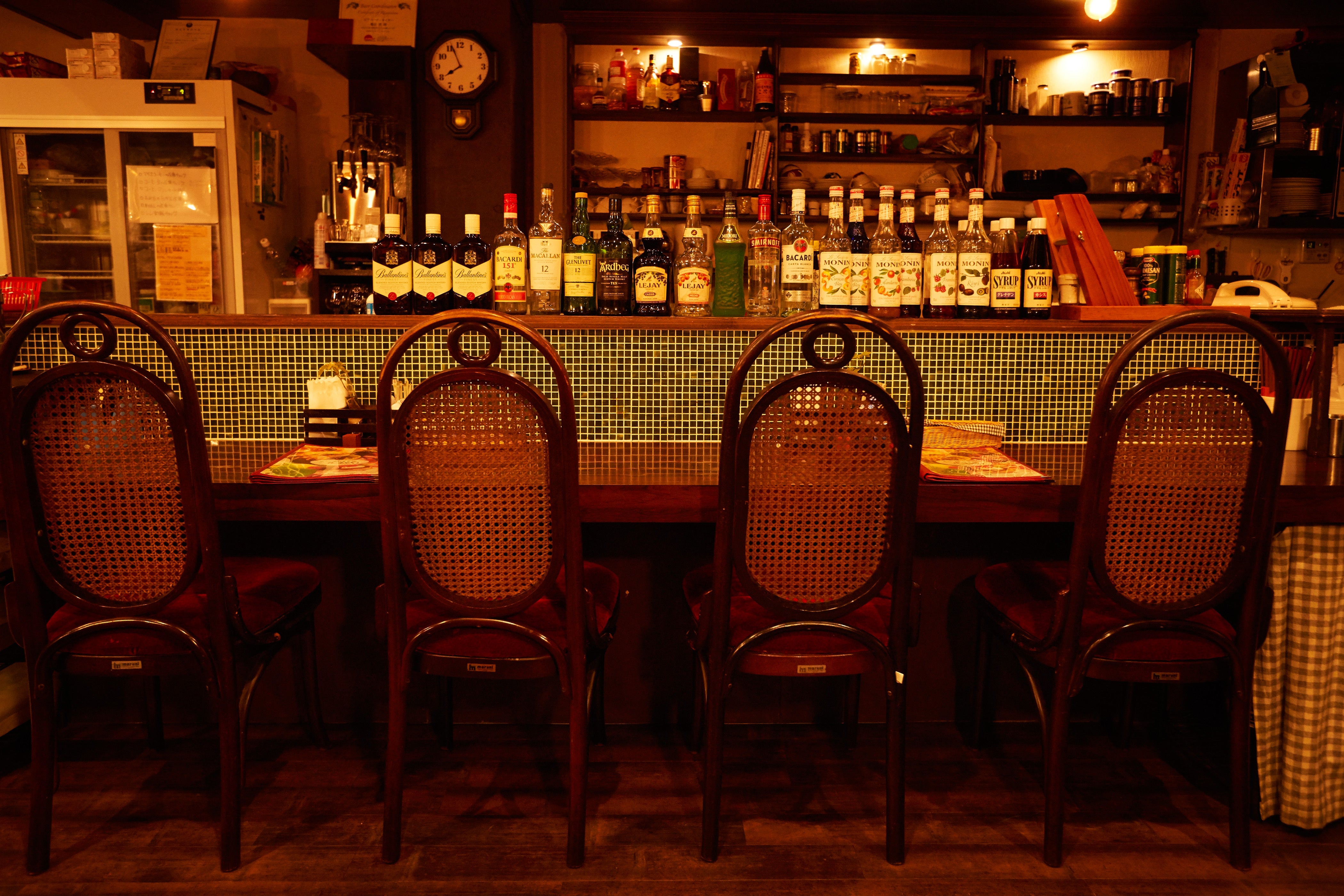 40年以上大事にリメイクしている藤椅子。カウンター席もあります。