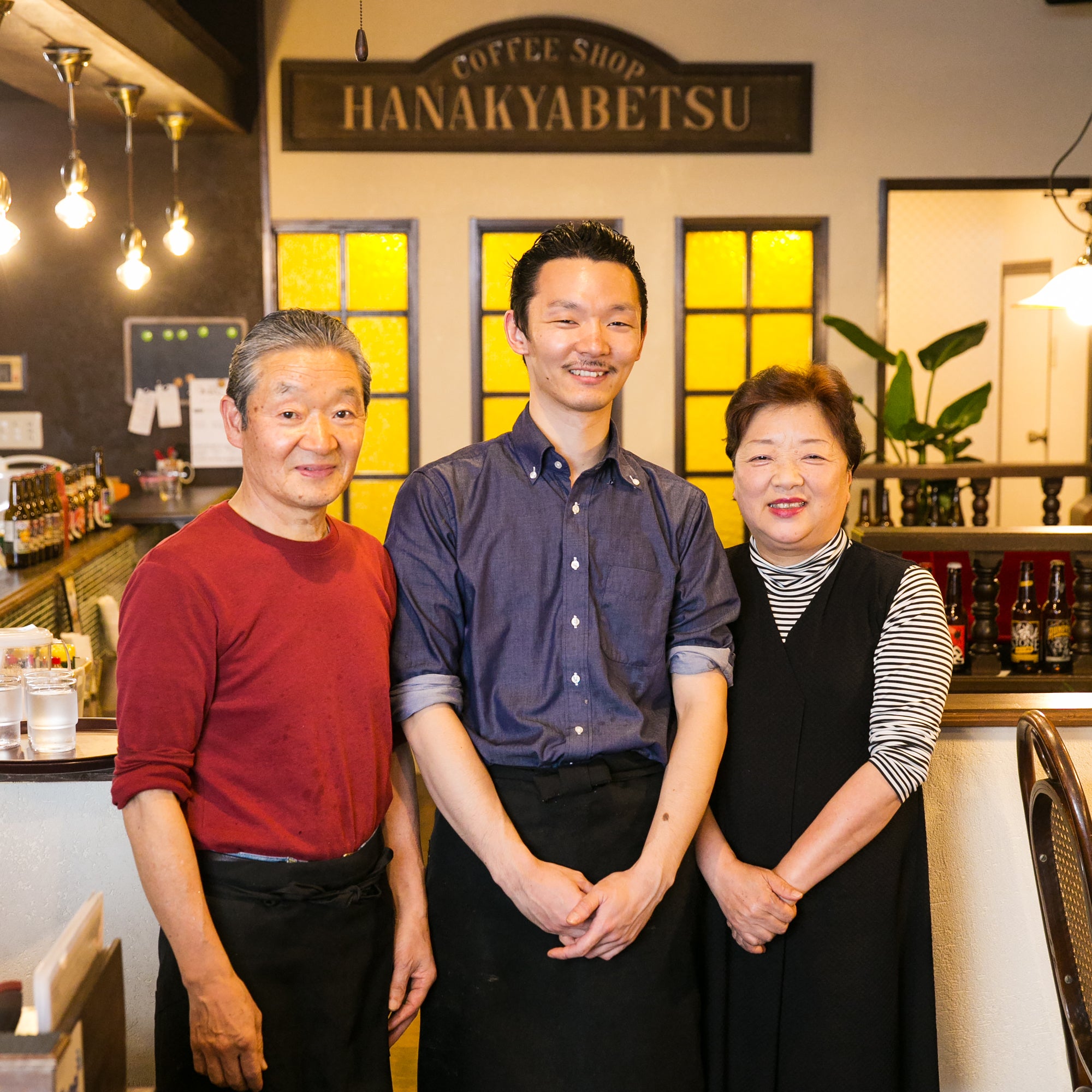 右:創業者 澤畠道子(叔母) 左:嶋田清(父) 中央:嶋田淳(移転直後の髭面のころ)