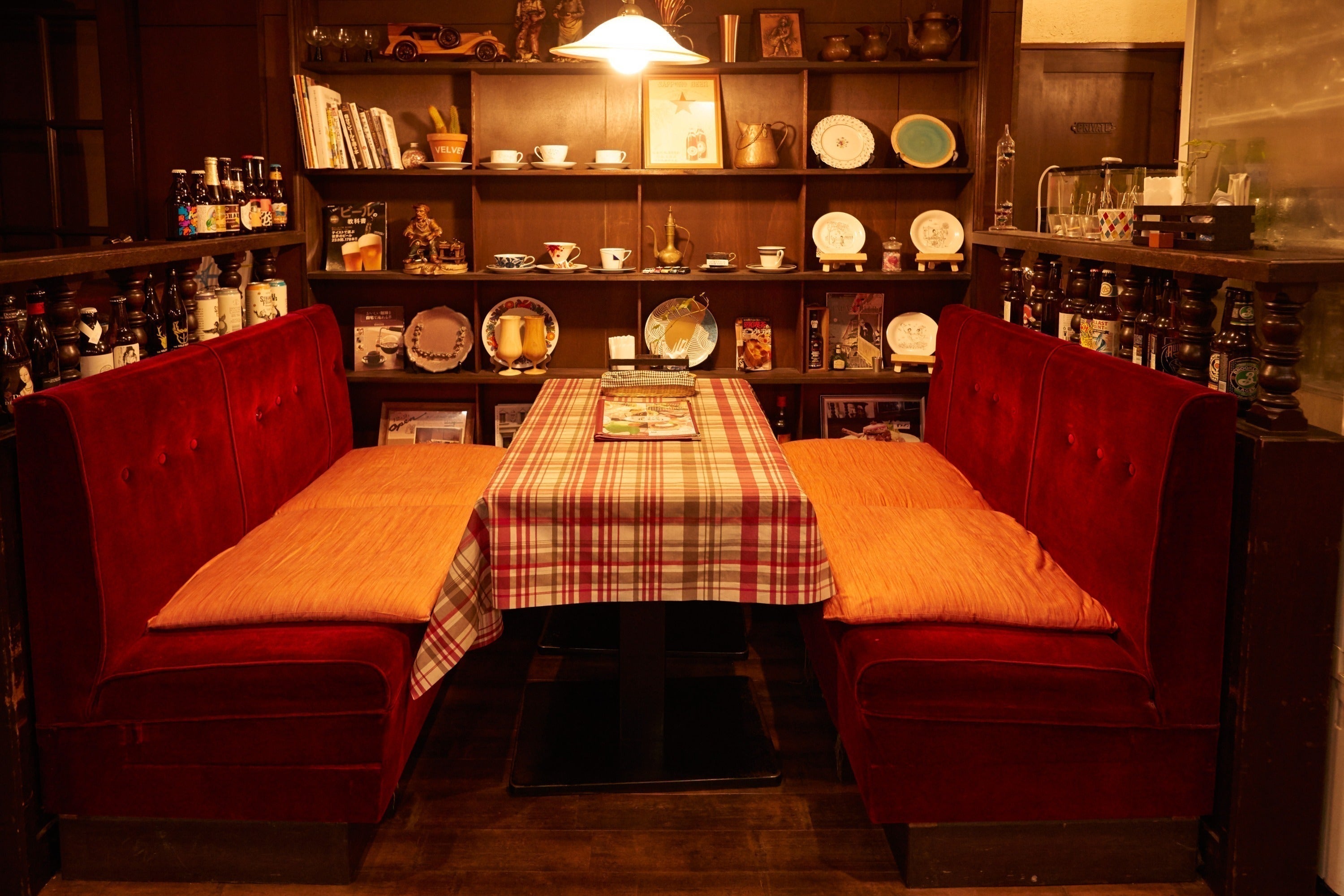 レトロ感あふれる人気のお席。ソファも照明も40年以上前の創業当時のもの。