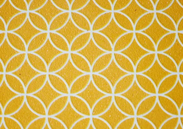 七宝(しっぽう):円形が永遠に連鎖し繋がる模様。円満、調和、人の御縁などの願いが込められた縁起の良い柄です。鬱金色という伝統色で、江戸時代には着物の色として大人気になり、あざやかな濃い黄色です。
