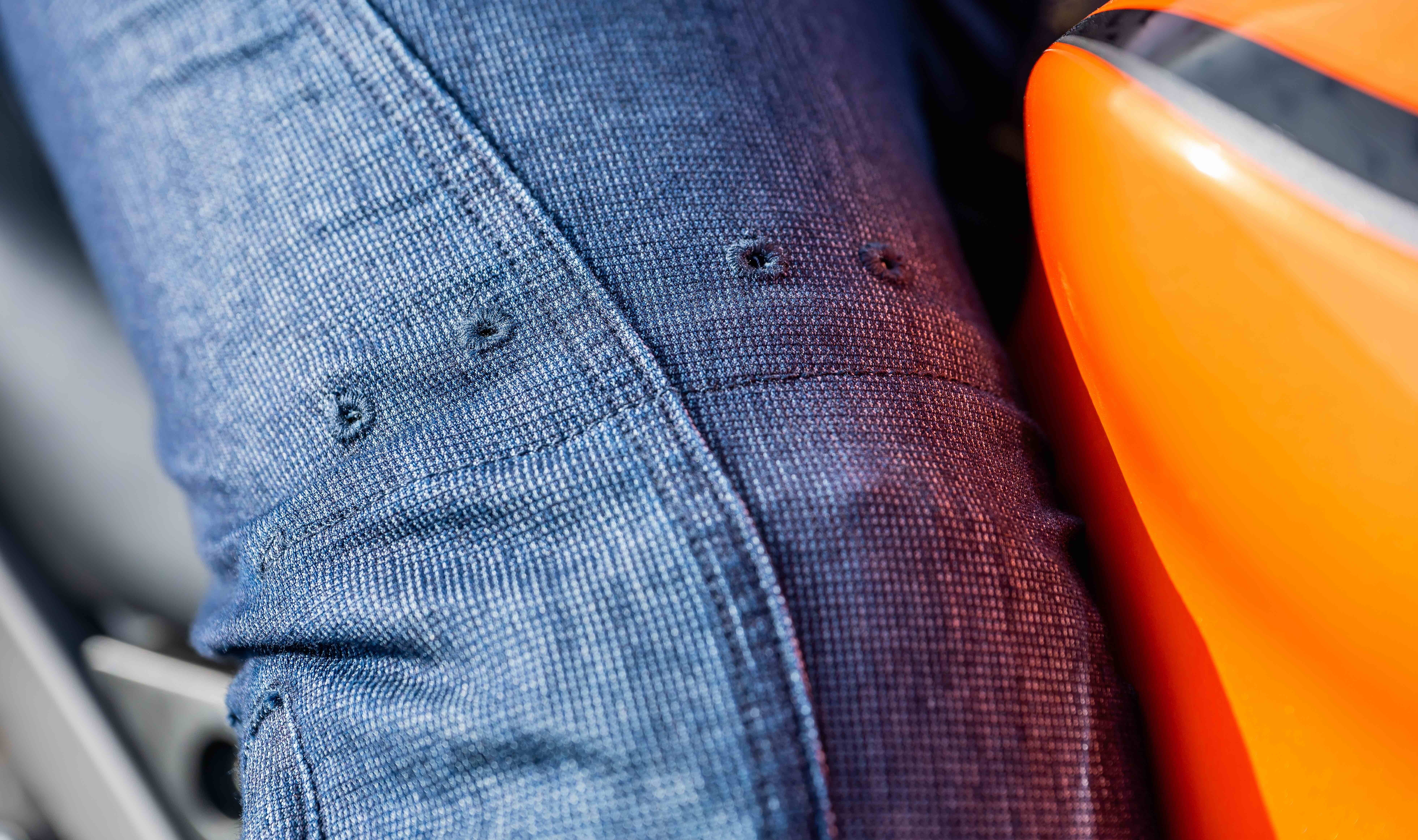 表部分だけじゃありません!膝裏にもベンチレーション孔を搭載しています(見えますか?)!膝から入ってきた走行風とジーンズ内の熱や湿気を外に排出しなくてはいけません。膝裏が汗ビショビショなライダーは多いと思います(笑)もう心配ないですよ!この膝裏ベンチレーションであなたの膝裏は常にサラサラです(笑)