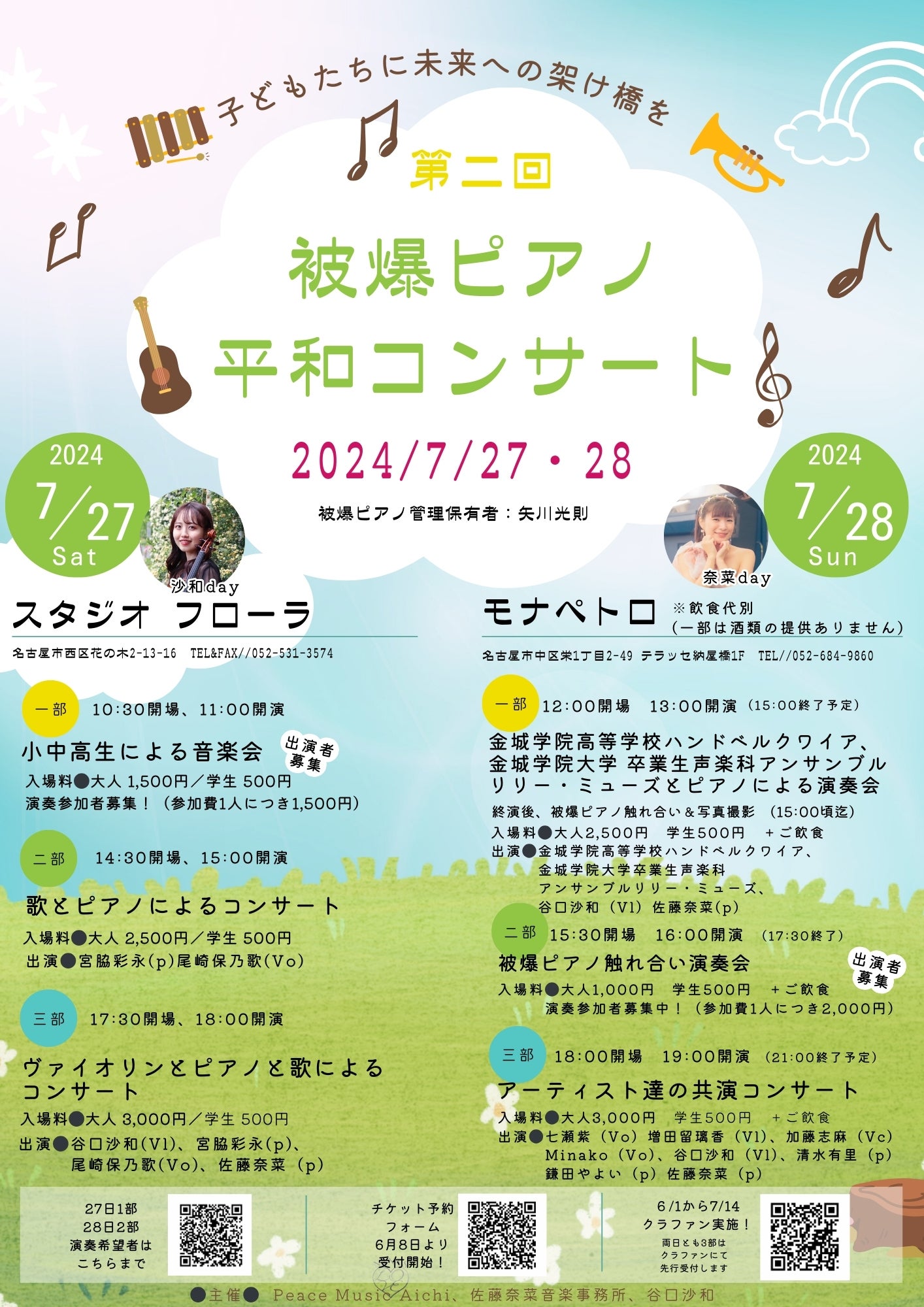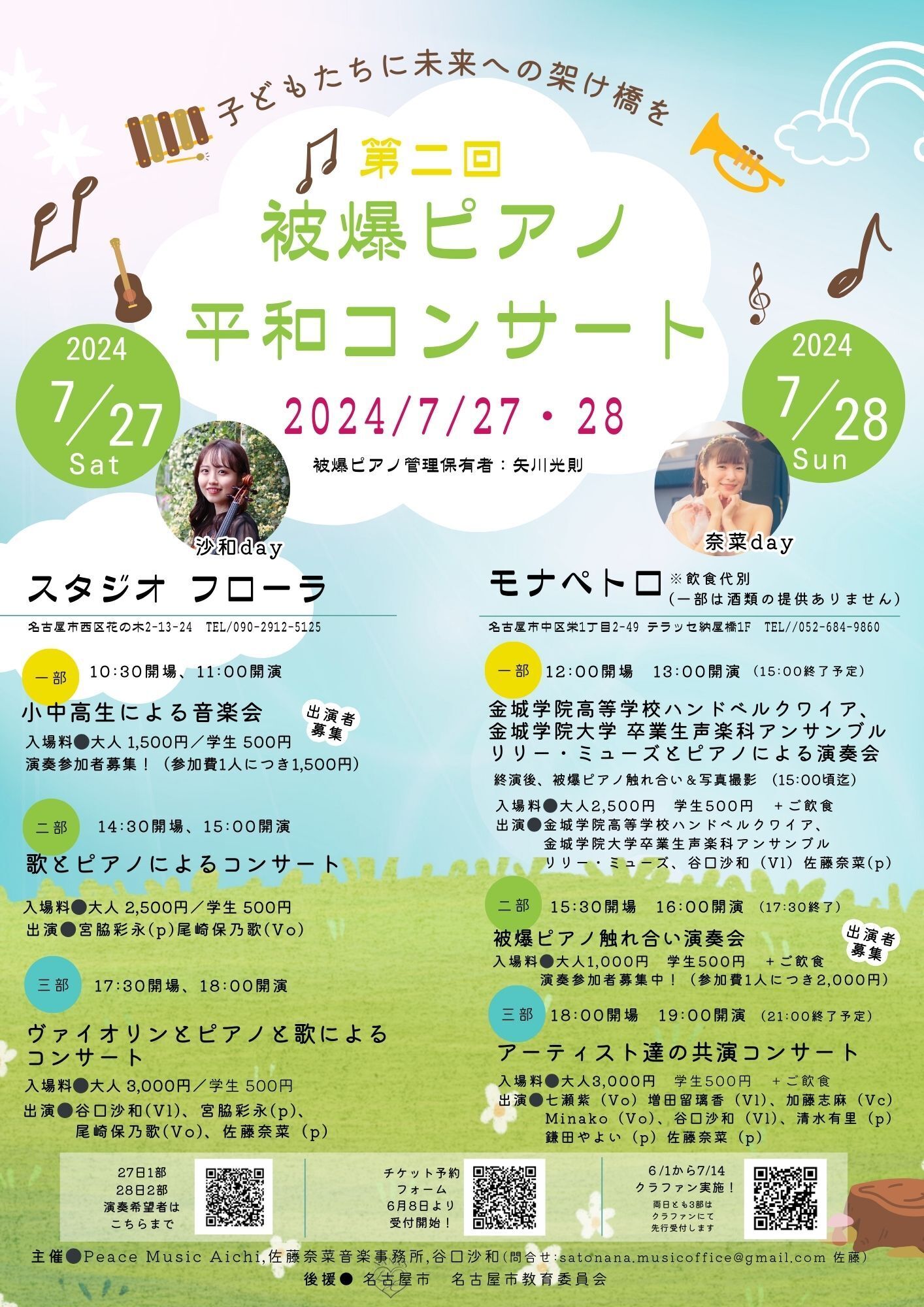 7/27(土)スタジオフローラにて、7/28(日)納屋橋モナペトロにて、被爆ピアノ平和コンサート合計6部による開催決定!