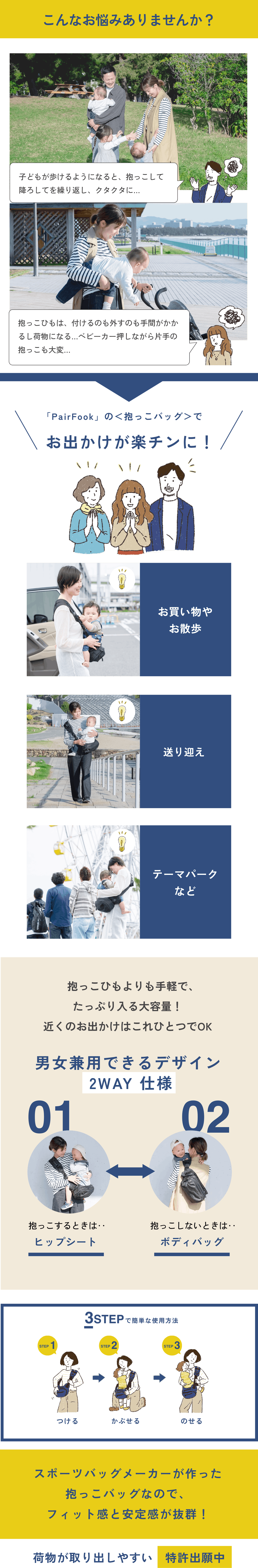 株式会社福井は長年、スポーツバッグやバイクに取り付けるバッグなどを作ってきました。だからこそ確信したのです。「もっと使いやすいベビーキャリーを作れる!」と。