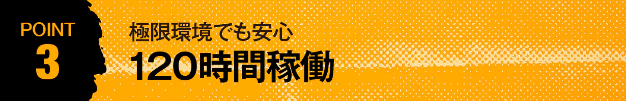 120時間という圧倒的な稼働時間は、充電の必要性を低減するため、極限環境での安全性を確保できます。