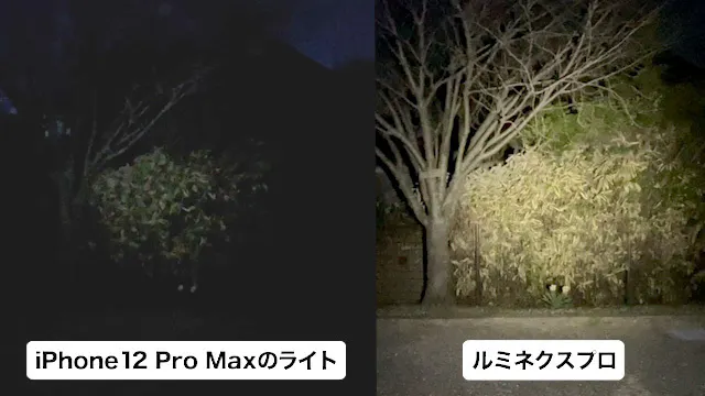 下の画像は、スマホのライトとルミネクスプロの照射範囲と明るさの比較です。