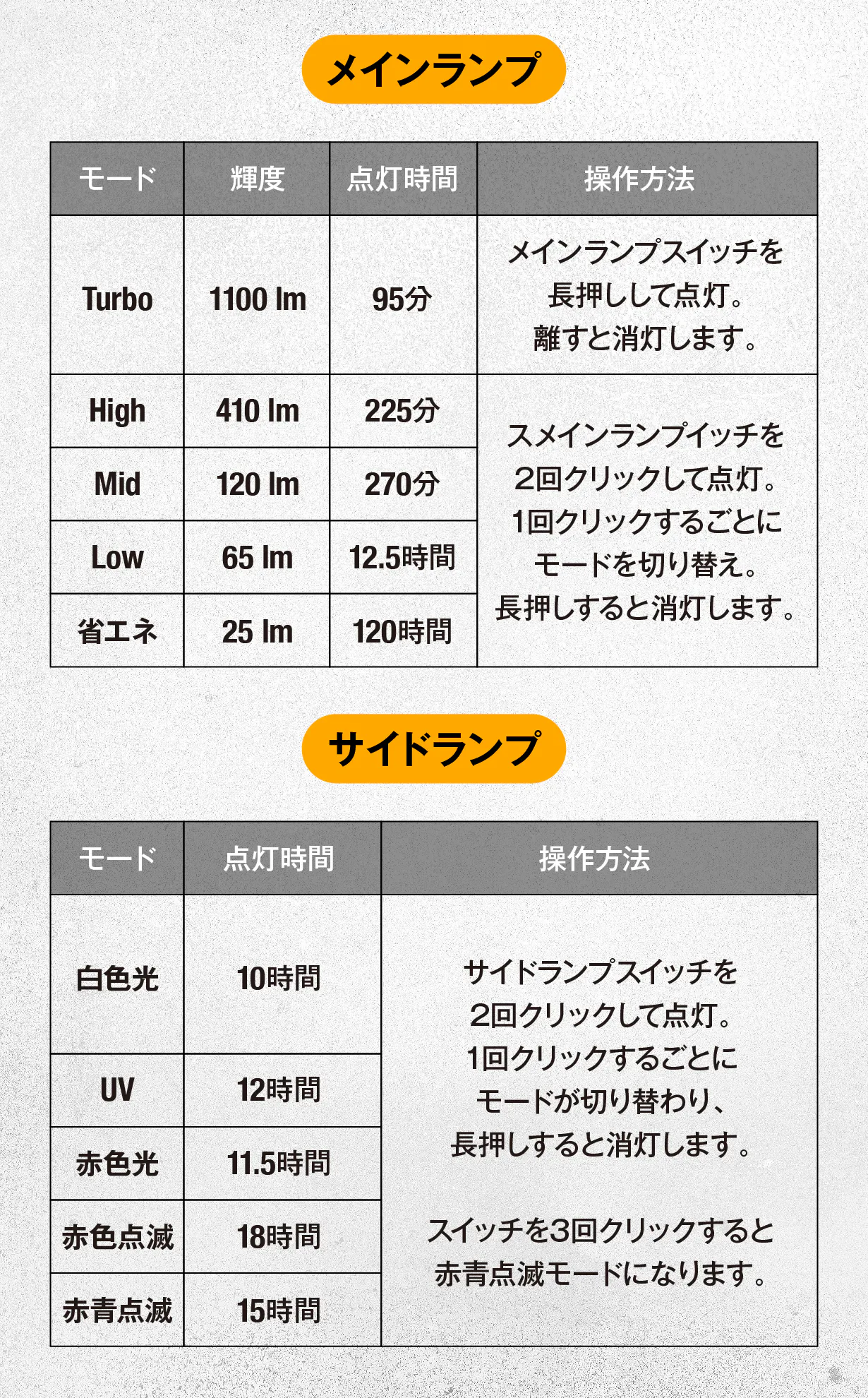 ライトモードの切り替えはボタン操作のみで簡単に行えます。
