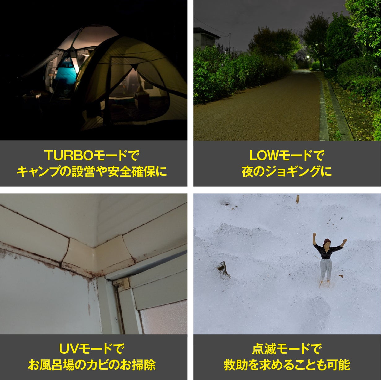この驚異的な明るさは、アウトドア・災害時・夜間作業など様々なシーンでご活用いただけます。