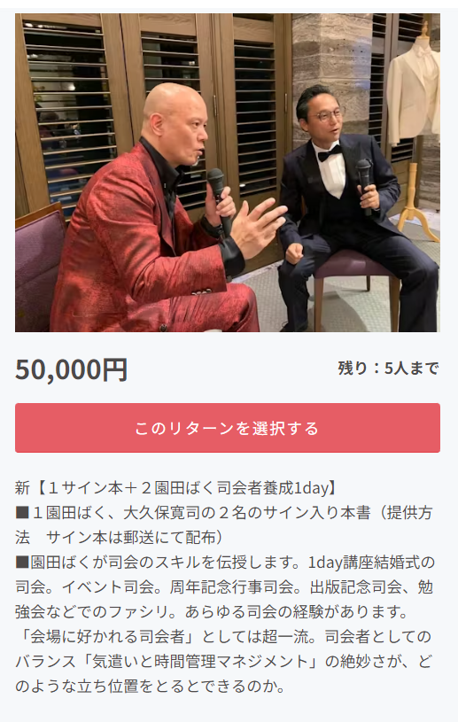 また、寛司さんと園田ばくが会社で講演する権利もあります。これは本当に破格なので、早い者勝ちです。
