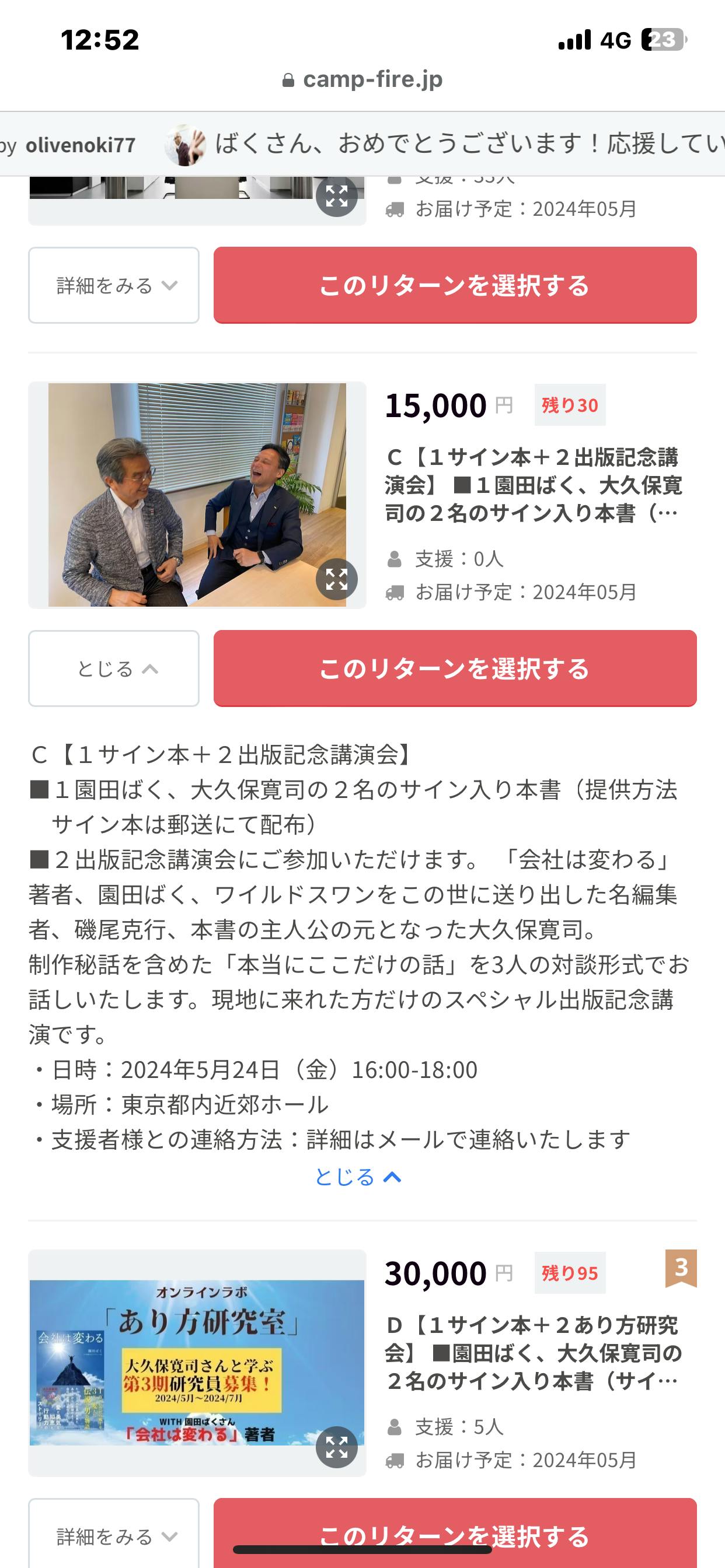完売しておりました、15000円の講演会リターンを追加で30席申請し、昨日公開できました。ご友人などでリターンに悩まれていた方がいらっしゃいましたら、お伝えしてください。(会場も100名以上入れるところを予約できました)