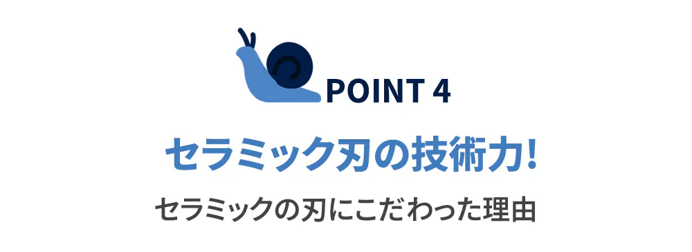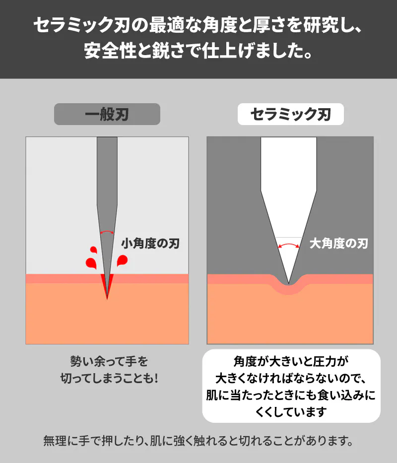 専用セラミック刃は角度が広く厚く、肌を切れにくくしています。