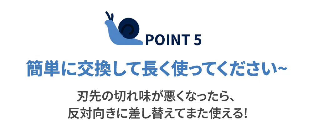 ナイフが摩耗すると、刃を逆にひっくり返して新品のように使用できます。替刃は紛失防止のため本体内部に保管できます。