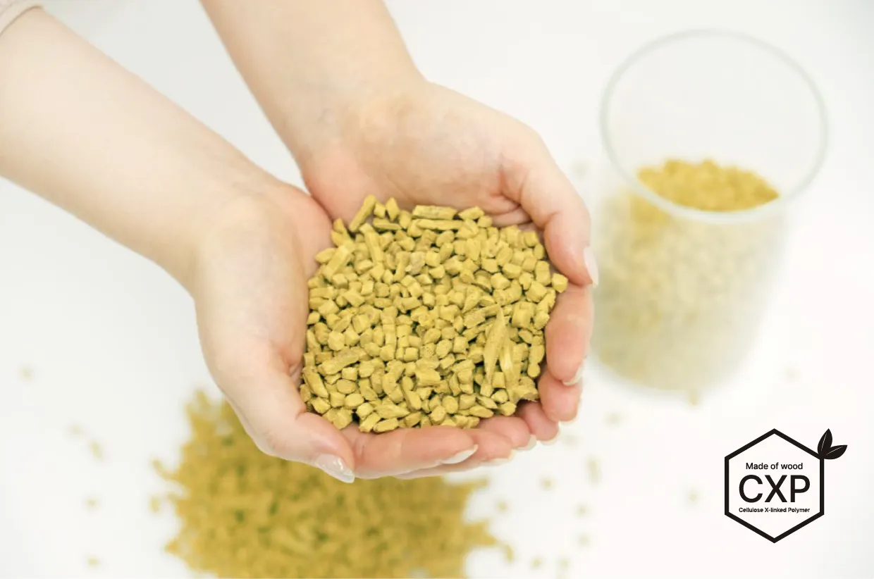 CXP(Cellulose Cross-linked Polymer)は、木を成す主成分であるセロウスを自己結合させて作られた熱可塑性素材です。
