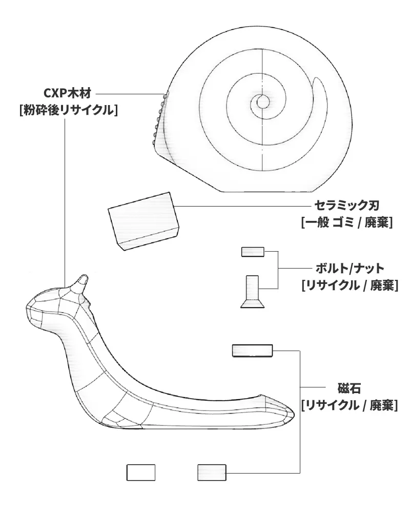 カッターツムリは通常のプラスチックではなくウッドベースのCXP素材で製作され、自然な木粉パターンが確認できます。