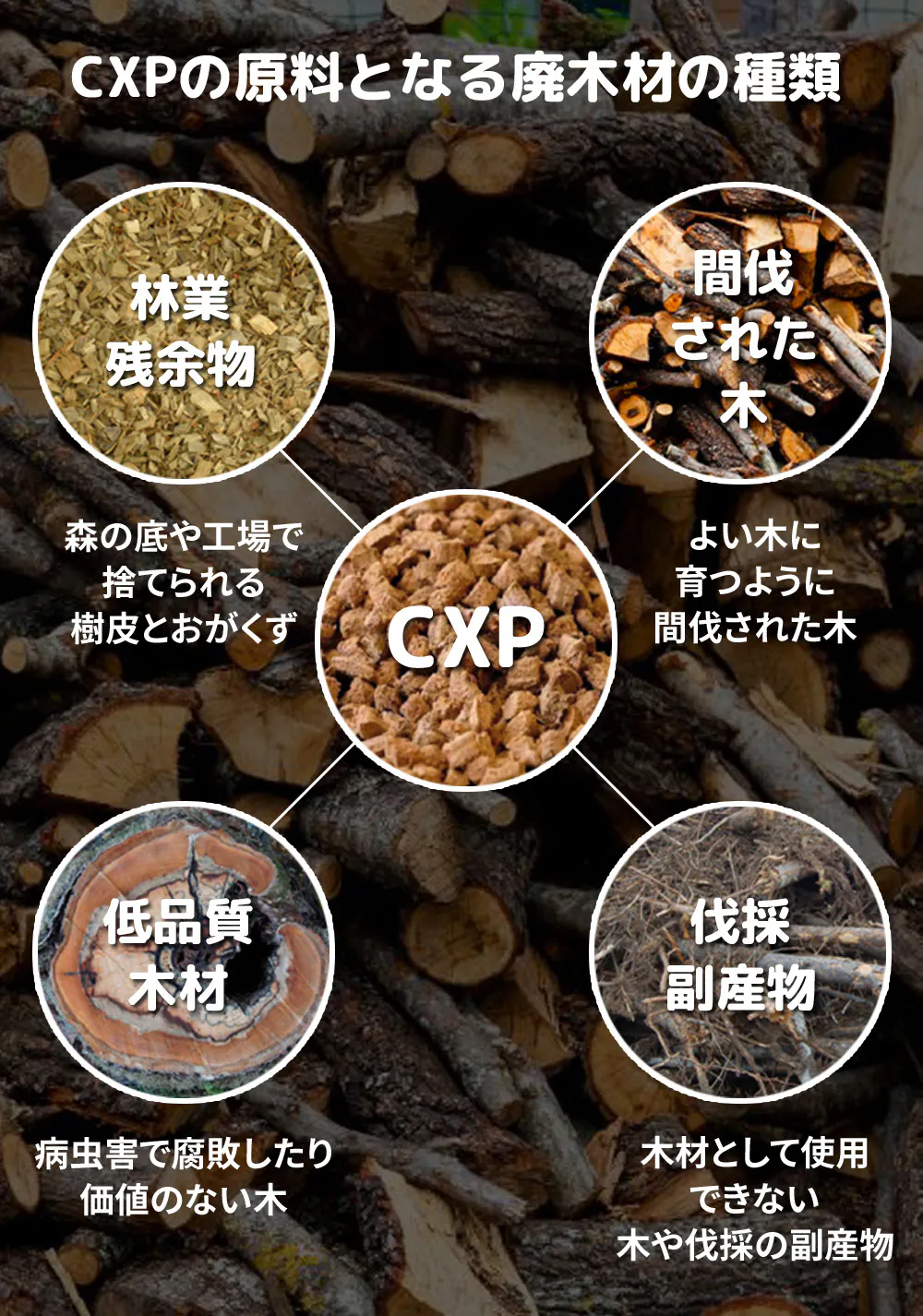 CXPは捨てられたり燃やされたりする廃木材を原料としているため、環境を損なうことなく、持続可能な森の経営に貢献できます。
