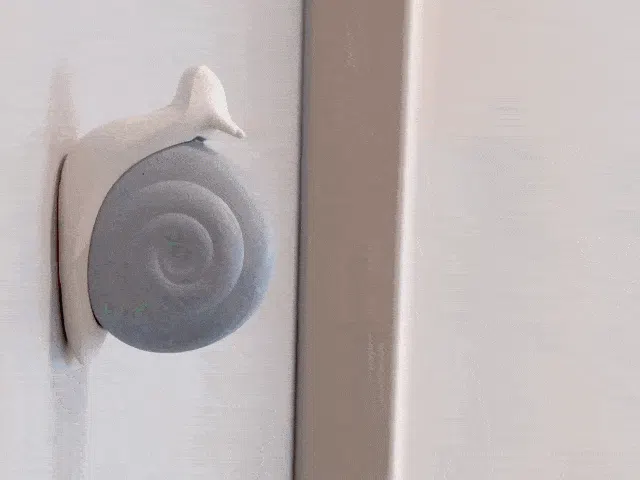 カッターを探し回る手間がかからず壁や玄関に貼っておいて使用するカッターで、インテリア小物や宅配の開封カッターが一つに製作したカタツムリカッターです。