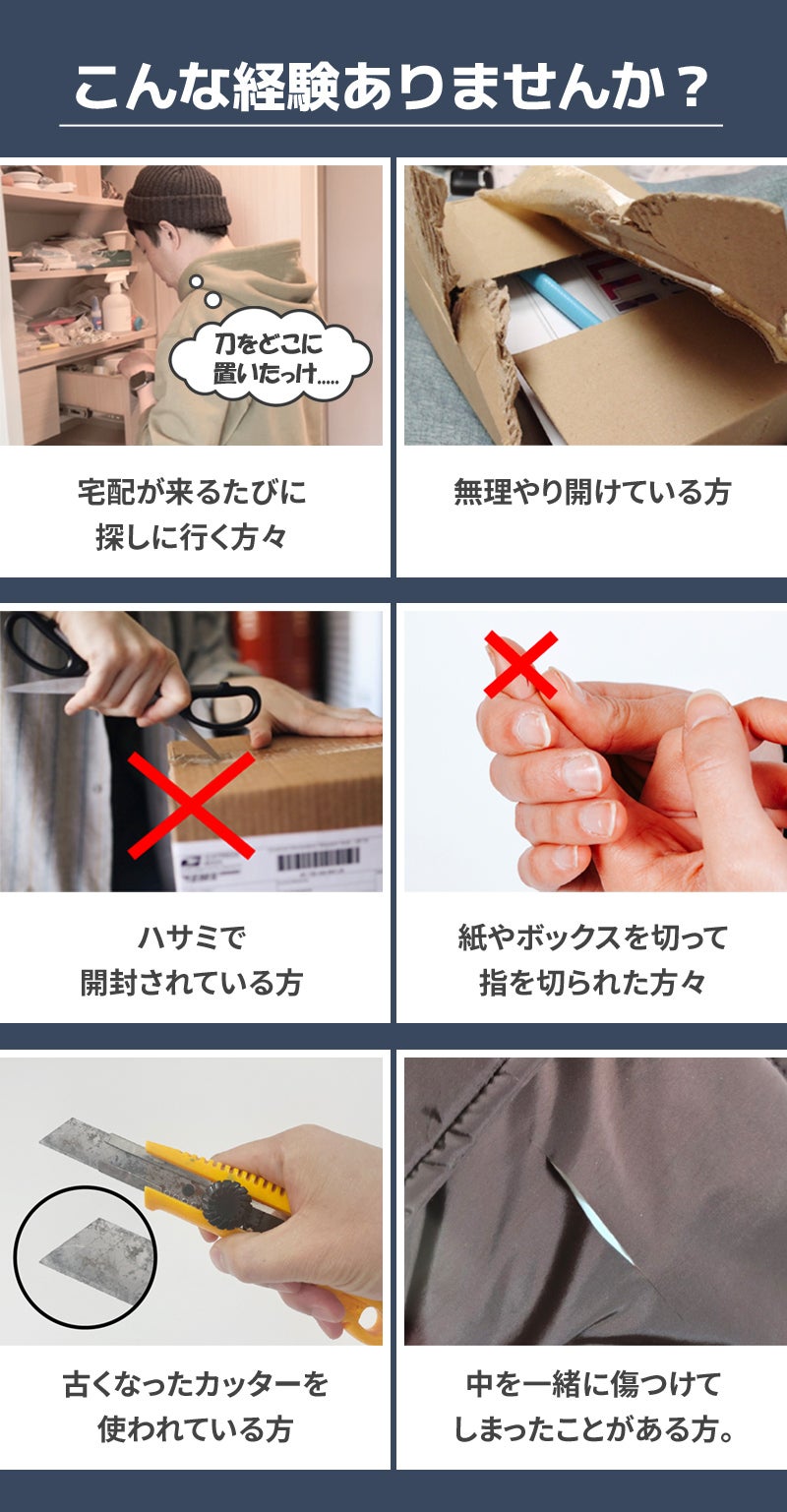 宅配ボックスからビニール、袋、ラベル、デリバリー料理の包装紙、ステッカー、DMなどまで切ることができるカッターです。