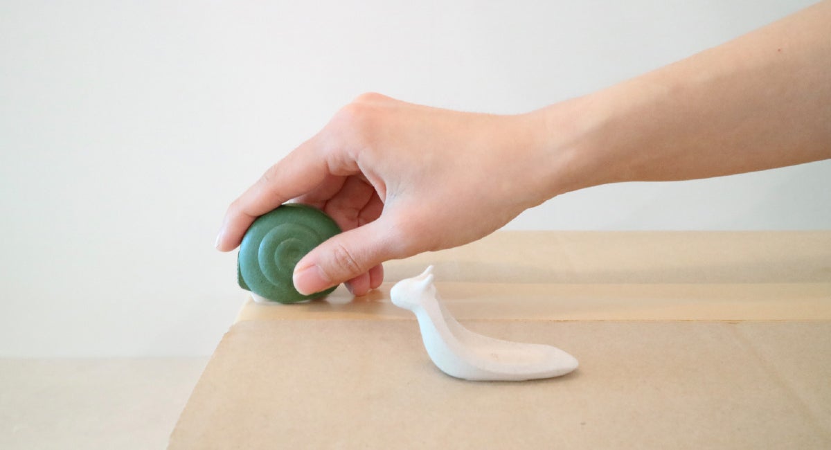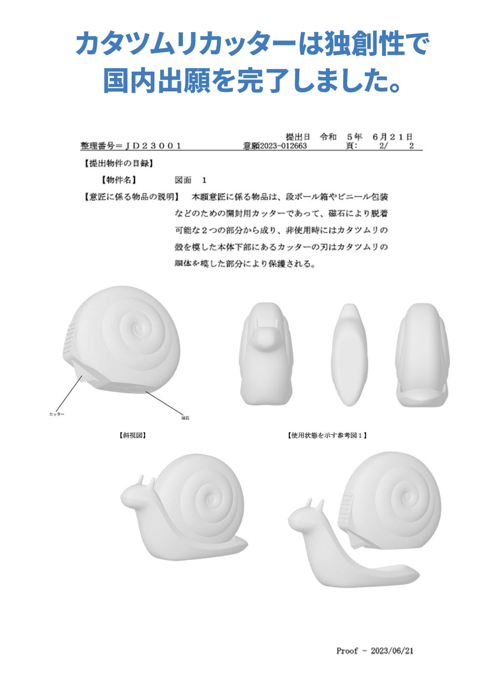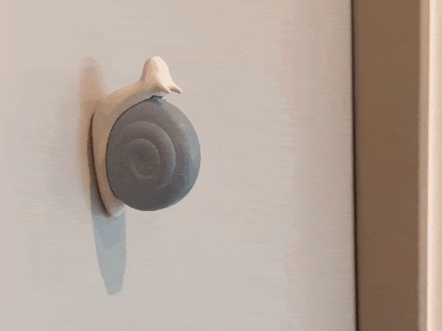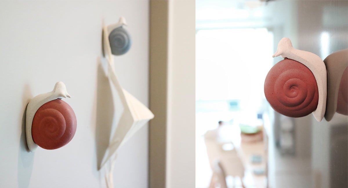 カッターを探し回る手間がかからず壁や玄関に貼っておいて使用するカッターで、インテリア小物や宅配の開封カッターが一つに製作したカタツムリカッターです。
