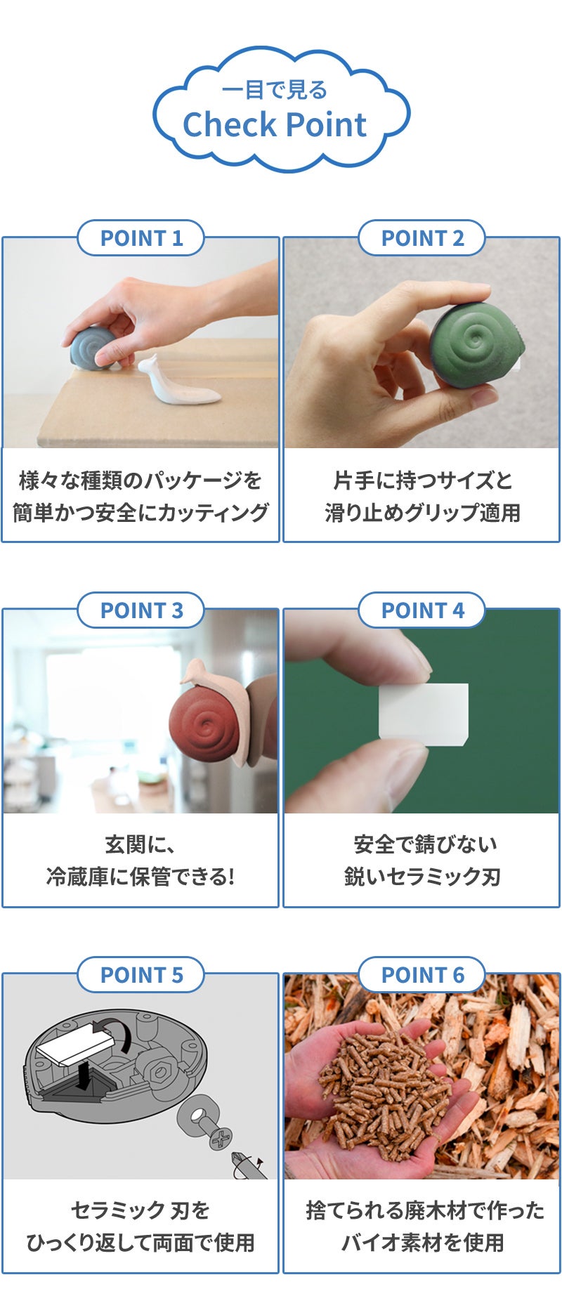 この小さくてかわいいカタツムリ一つで十分です。さくて楽に使い専用セラミック刃で安全に使えるカッターツムリ!