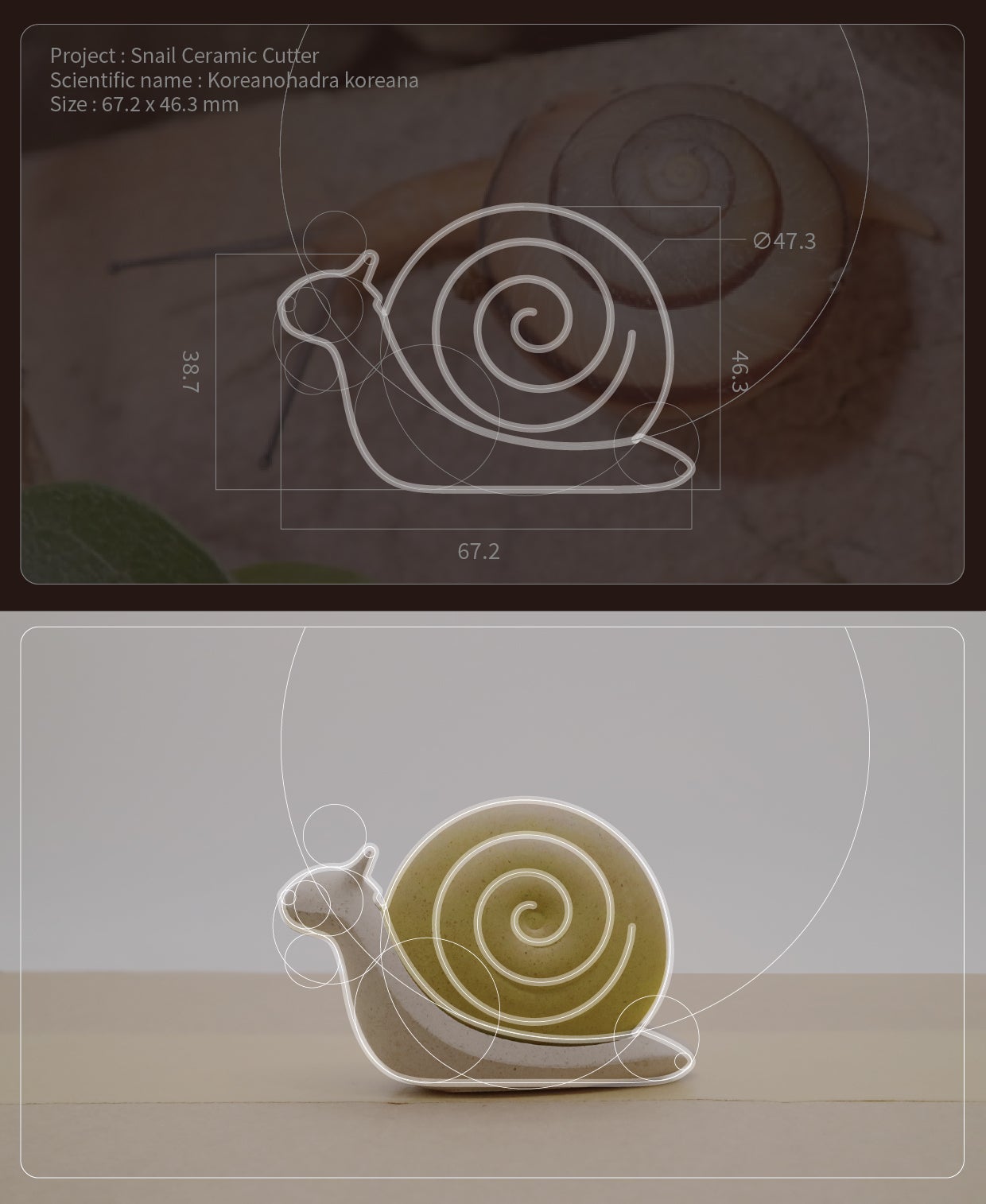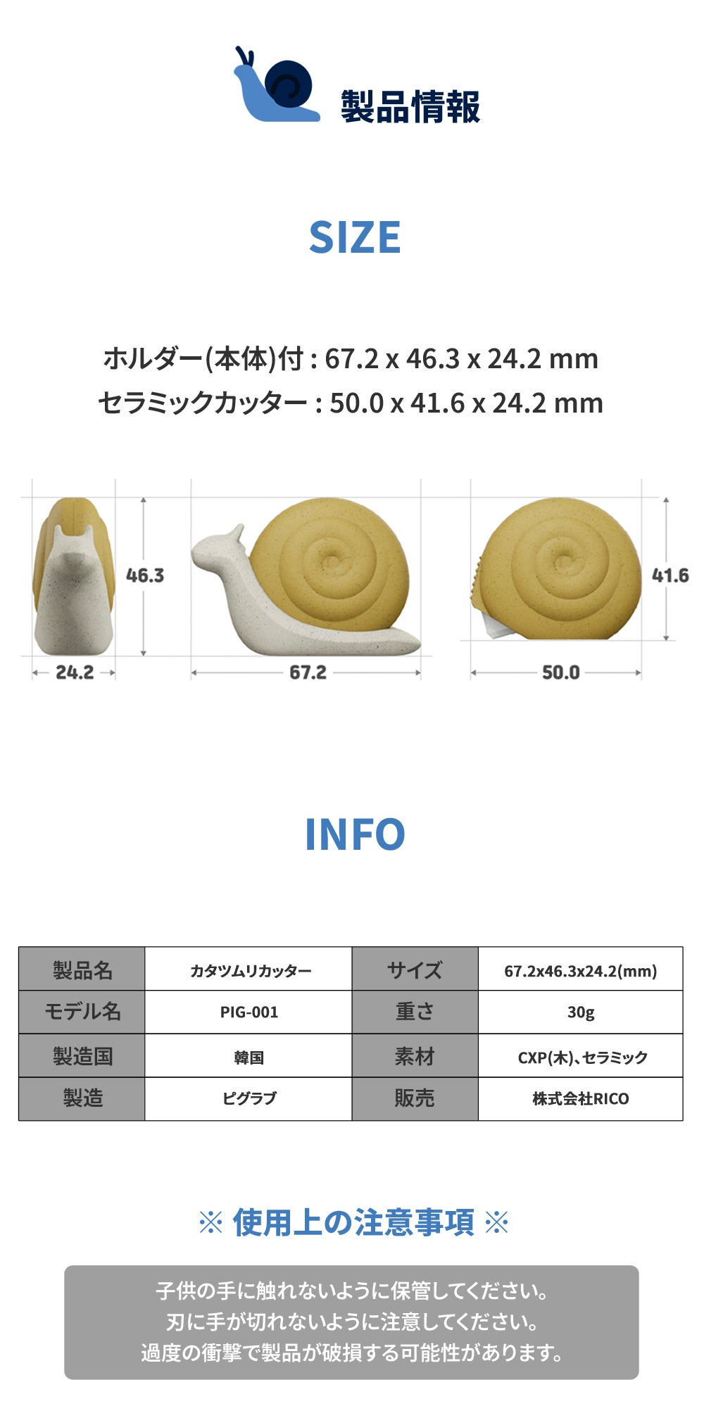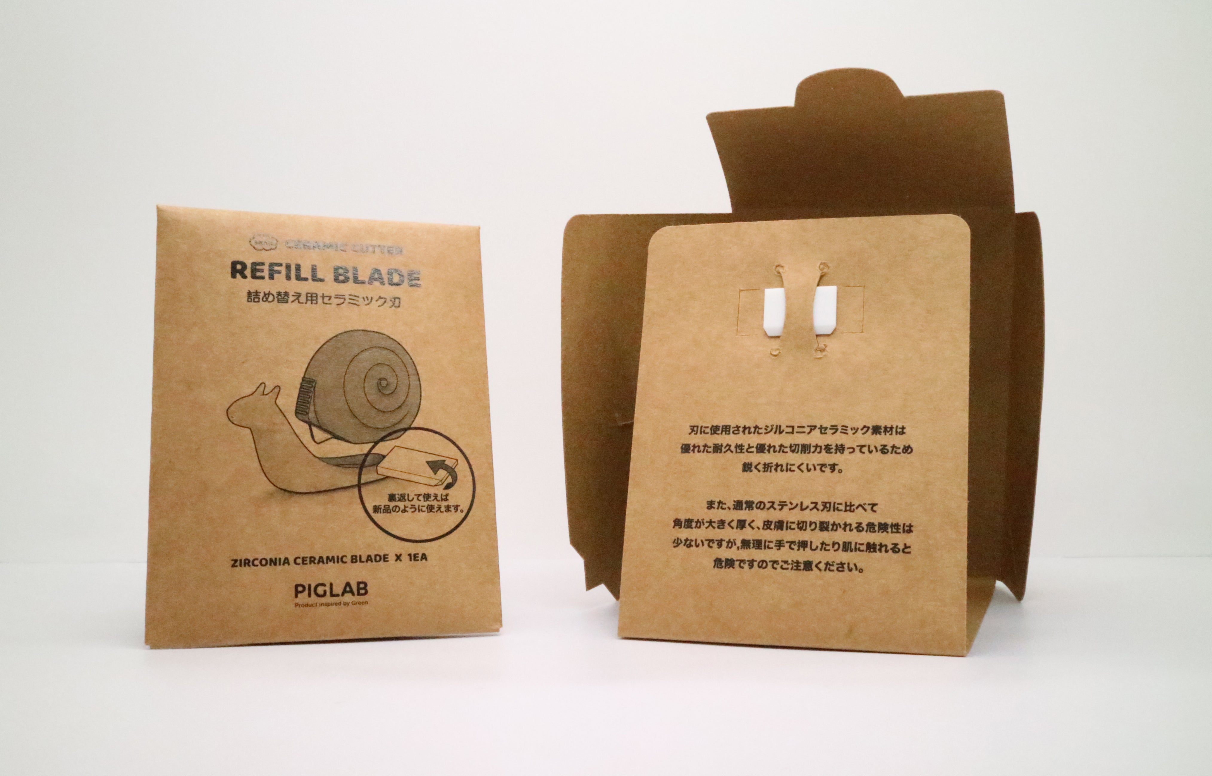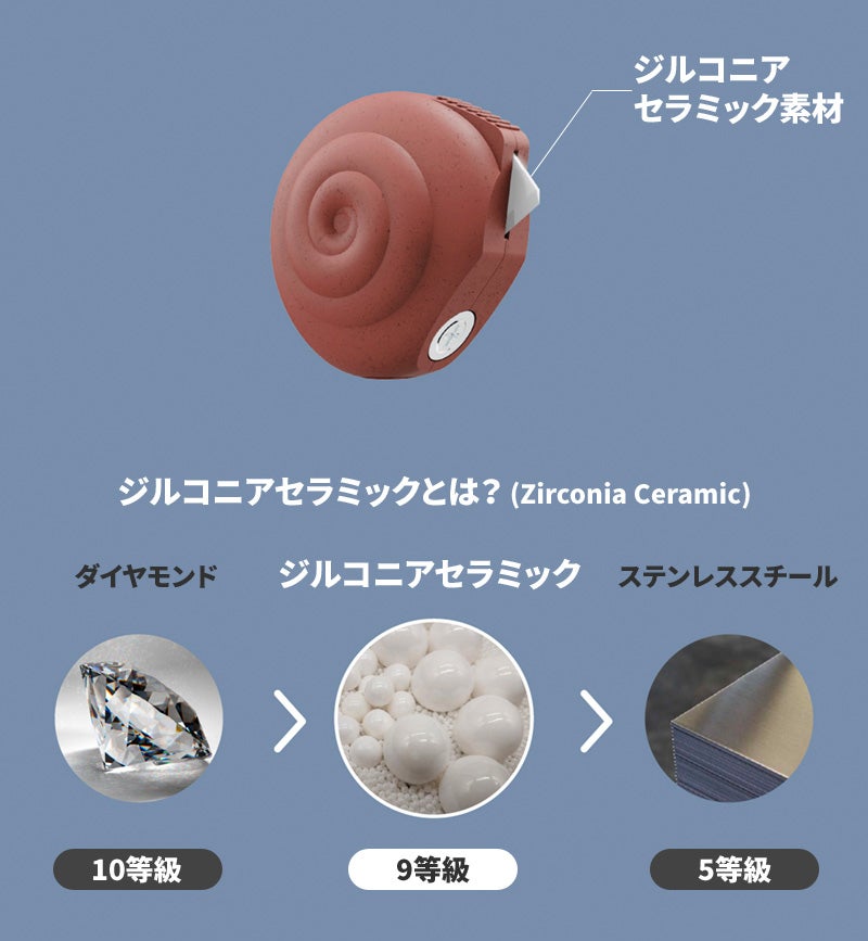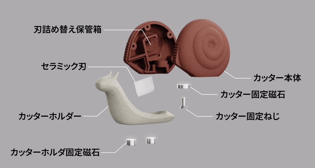 そしてジルコニアセラミックで製作された刃は両面使用が可能で、カタツムリ本体の内周にはスペア刃を保管できる空間を設計しました。インテリア性と安全性を兼ね備えたカタツムリカッター! 一度使ってみてください。