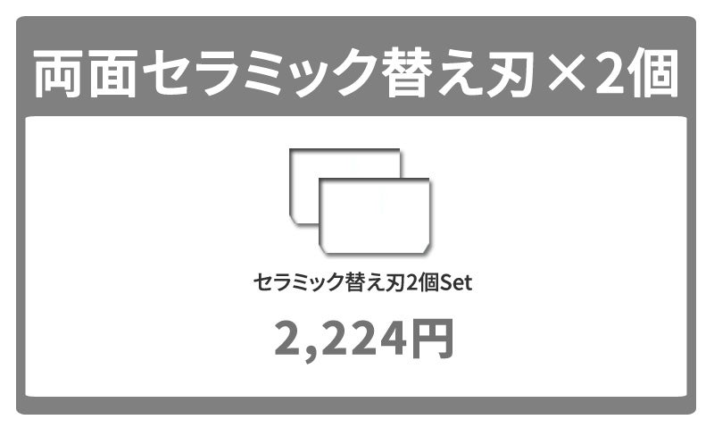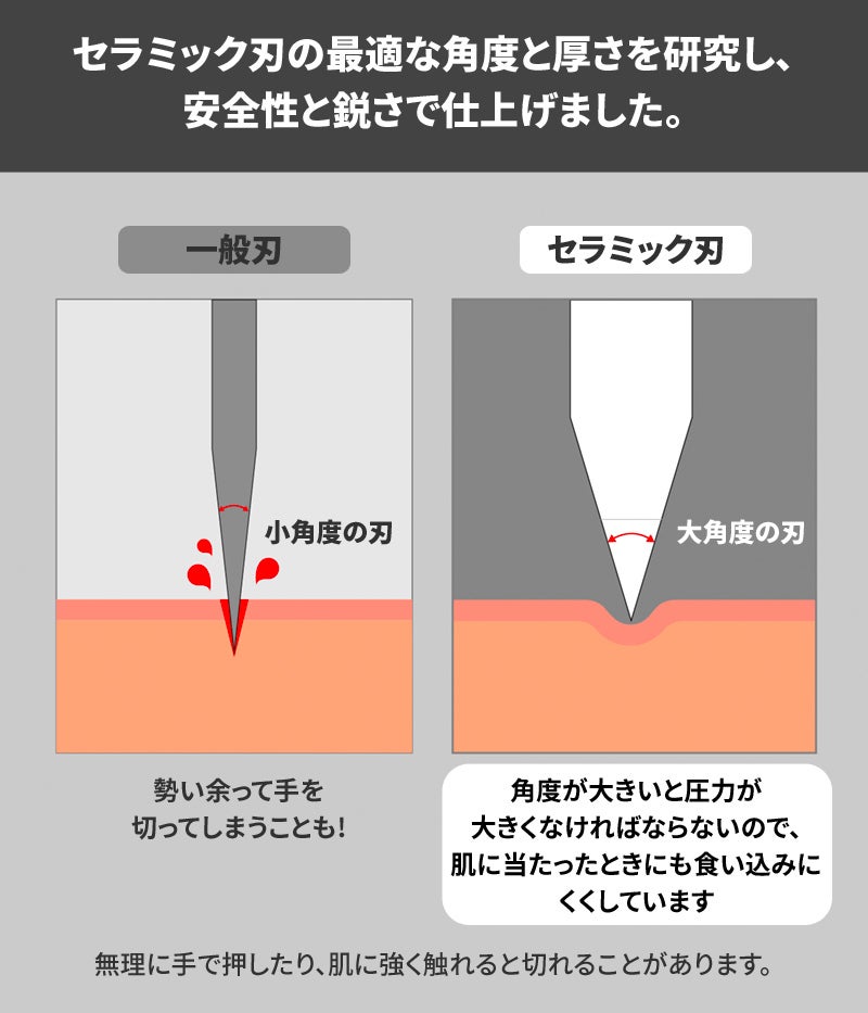 専用セラミック刃は角度が広く厚く、肌を切れにくくしています。