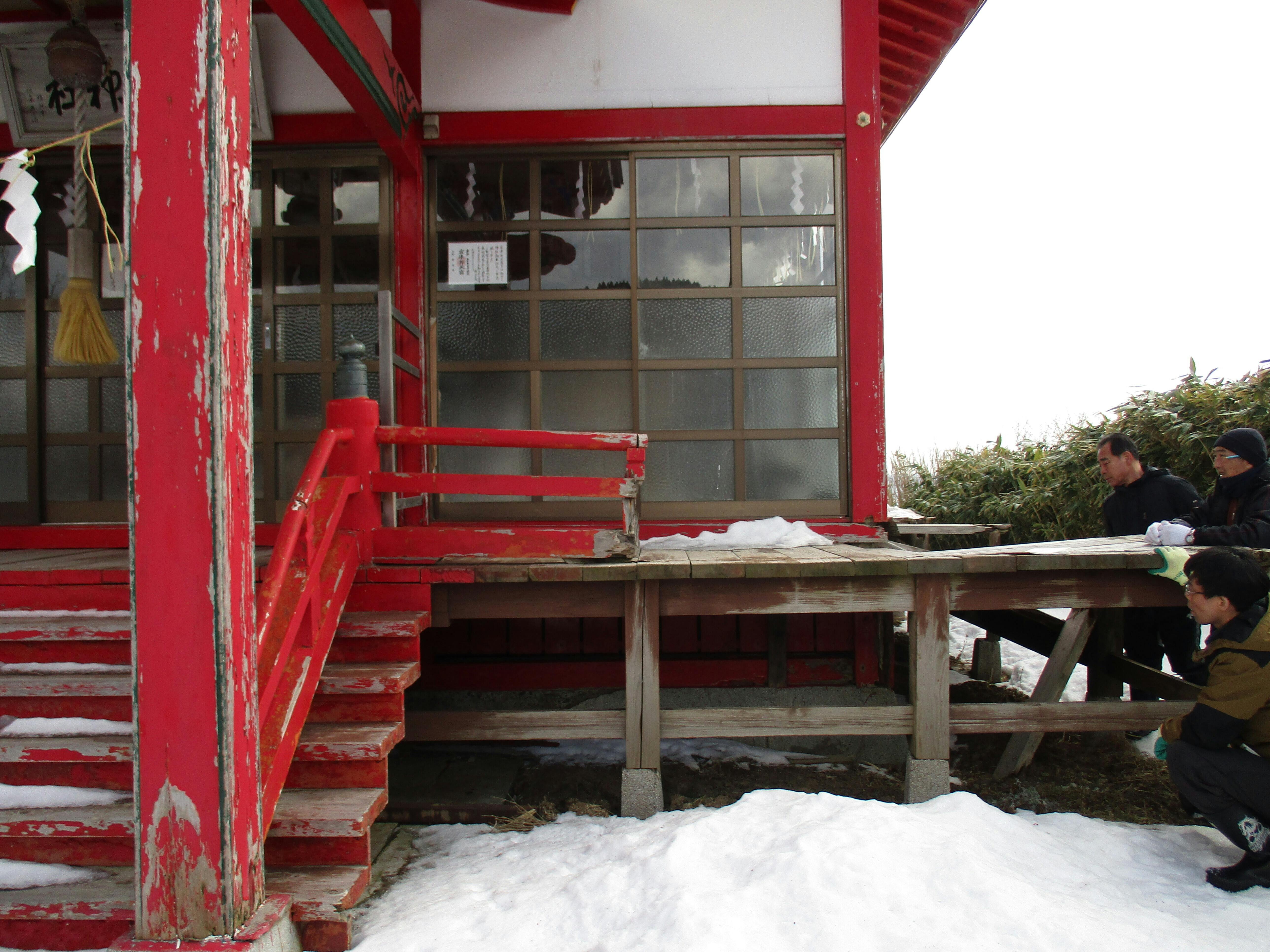 こんにちは!島の文化財の宮津弁天宮です。有志での寸法測定の姿です、島はプラス3度です。フェリーは波が高く全便欠航です。飛行機は運行しました、今日は函館便でした。海はマスが取れています、今の所は小さいですが。3寸角は乾燥後は軽くなりますよ。一安心ですよ。明上雅孝。