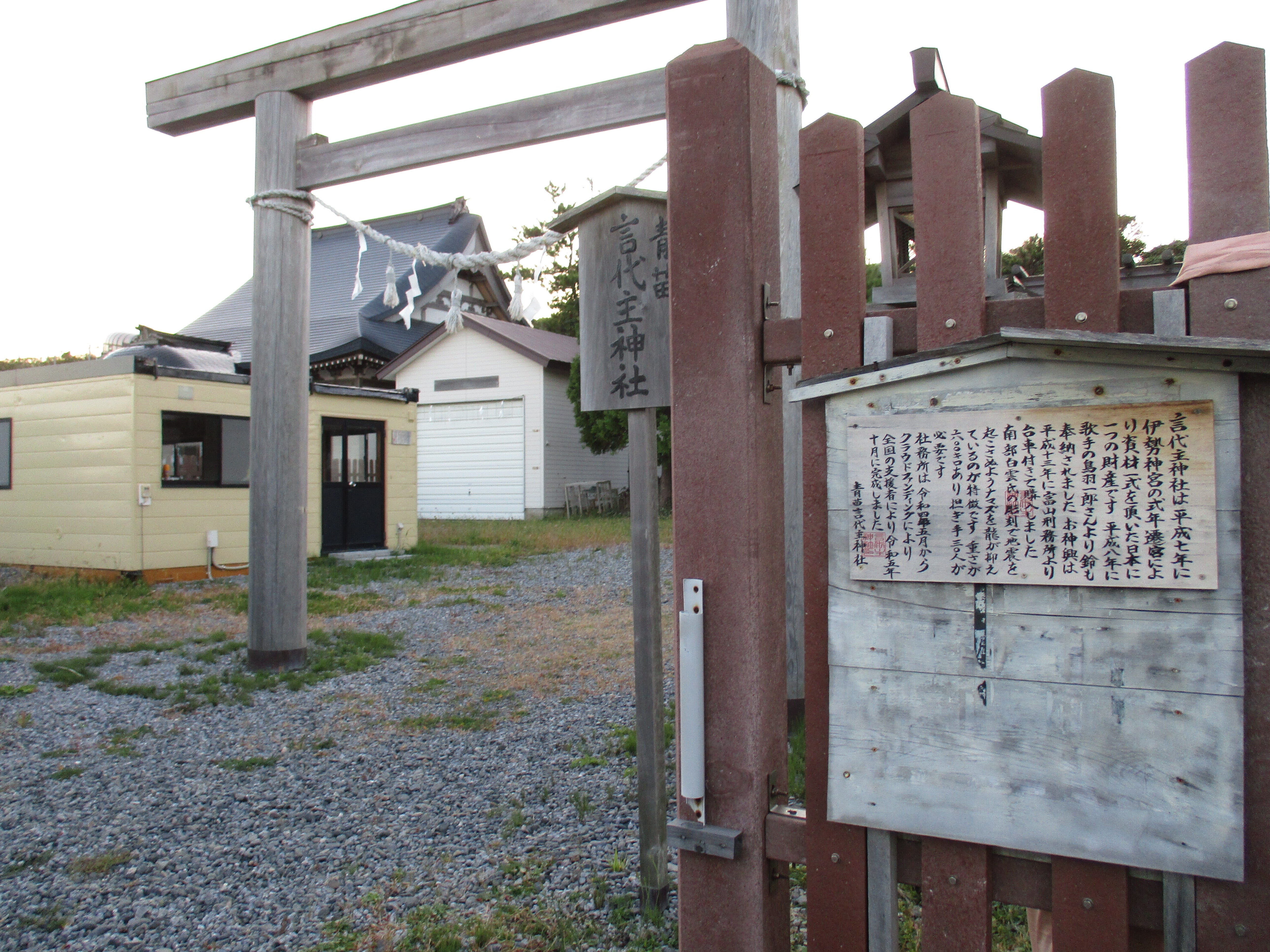 こんにちは!事代主神社のしめ縄は2か所にあります、島は風が強く塩害も強く、しめ縄の痛みが激しいです。神社の屋根も銅板ですが錆が出ているようです。今は事代主神社では維持費の募集をしています、1口4000円です。返礼品として礼状と金粉の和紙で手帳型の御朱印を1枚を郵送しています。残りの3000円ほどをしめ縄などの、備品の購入に充てます。口座振り込みになりますが。090-5984-1384。明上雅孝。