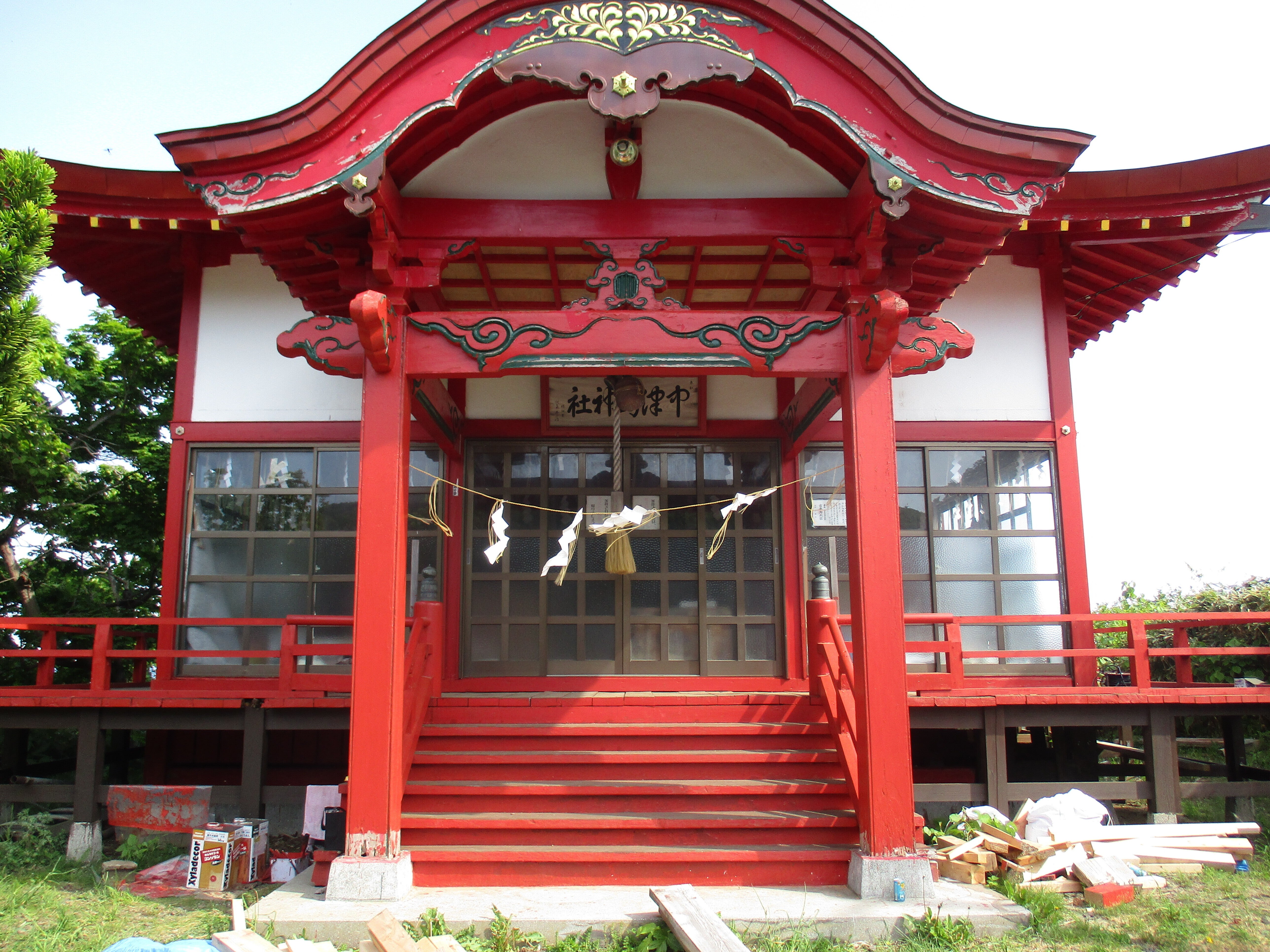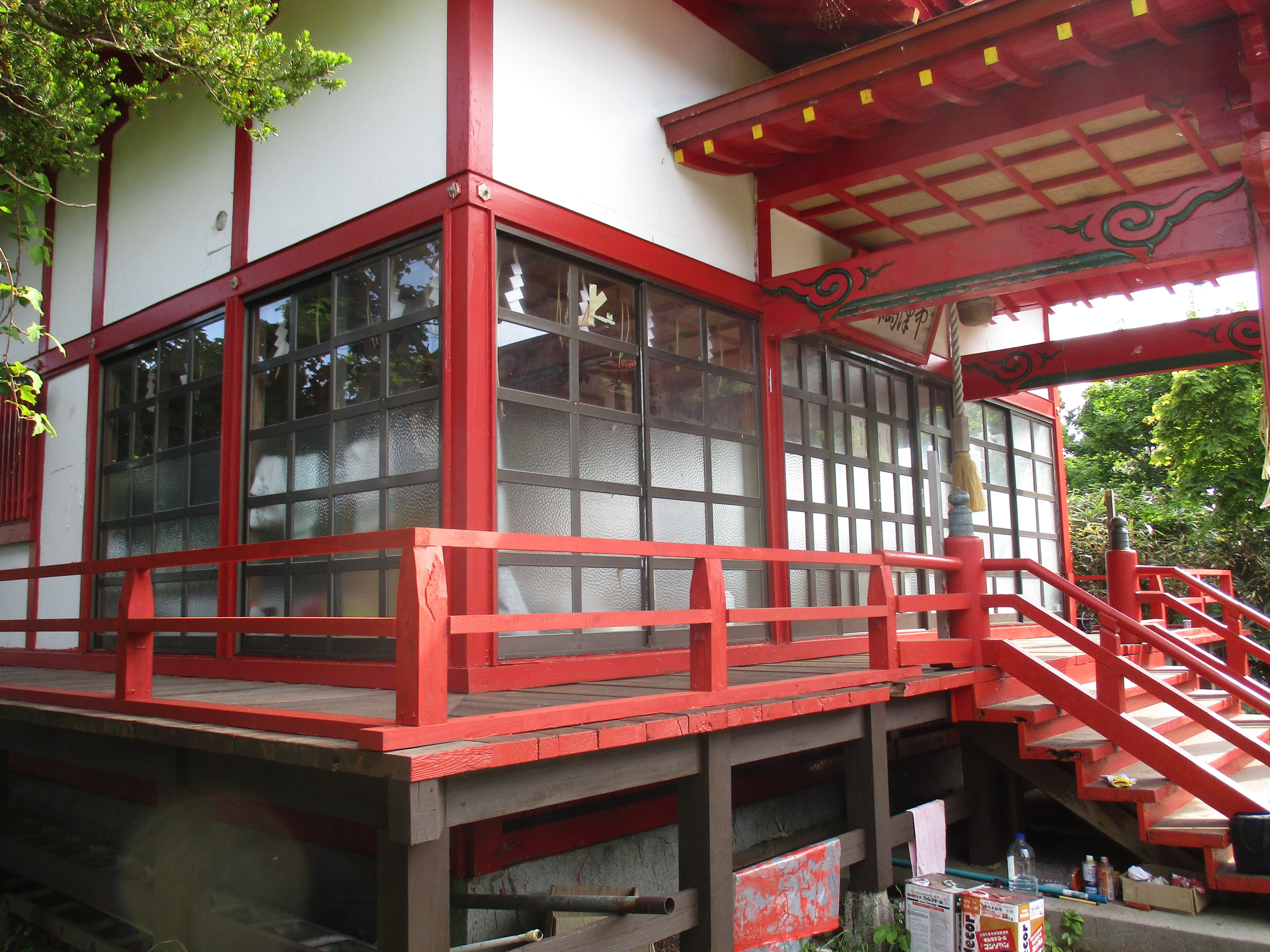 こんにちは!昨日の写真です。島の文化財の宮津弁天宮です。回廊も手すりも完成しました。表面もそれぞれペンキの仕上げも終わりました。後は隙間のコーキングや窓枠の色のはげたところの確認です。形は整いました。回廊を歩き後ろから奥尻島を見ると絶景です。支援者に感謝です。明上雅孝。