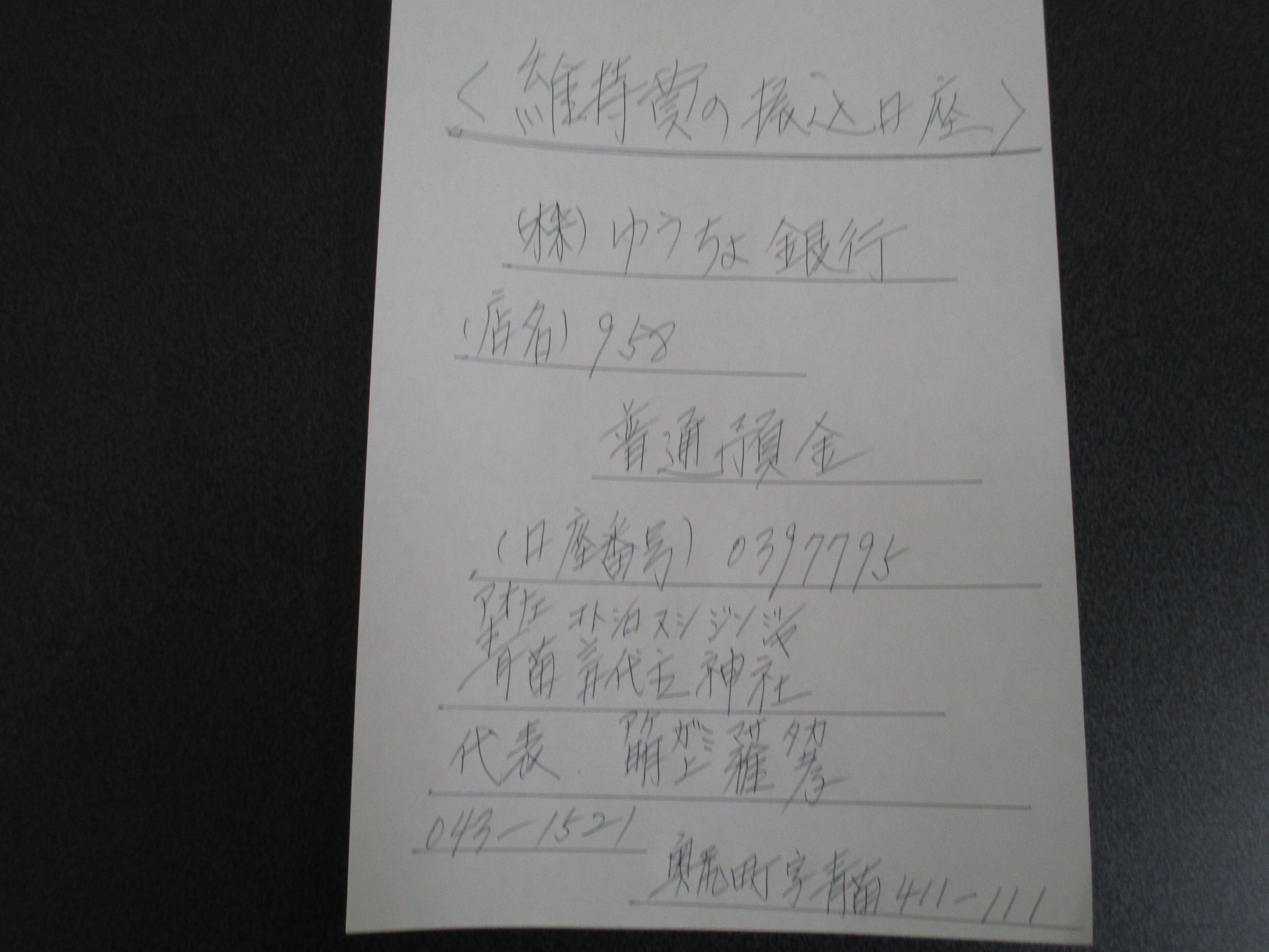 こんにちは!ようやく郵便局の局長さんに聞いてきました。いつも銀行の振り込みなので、どうしたらいいのかと。事代主神社の維持費は上記の通り書くと分かるとのことでした。年寄りには記憶が乏しいです。銀行同士なら分かりますが、時代についていけません。でも諦めないで活動報告をしていきます。奥尻島の為に。支援者に感謝の心は忘れません。090-5984-1384、明上雅孝。