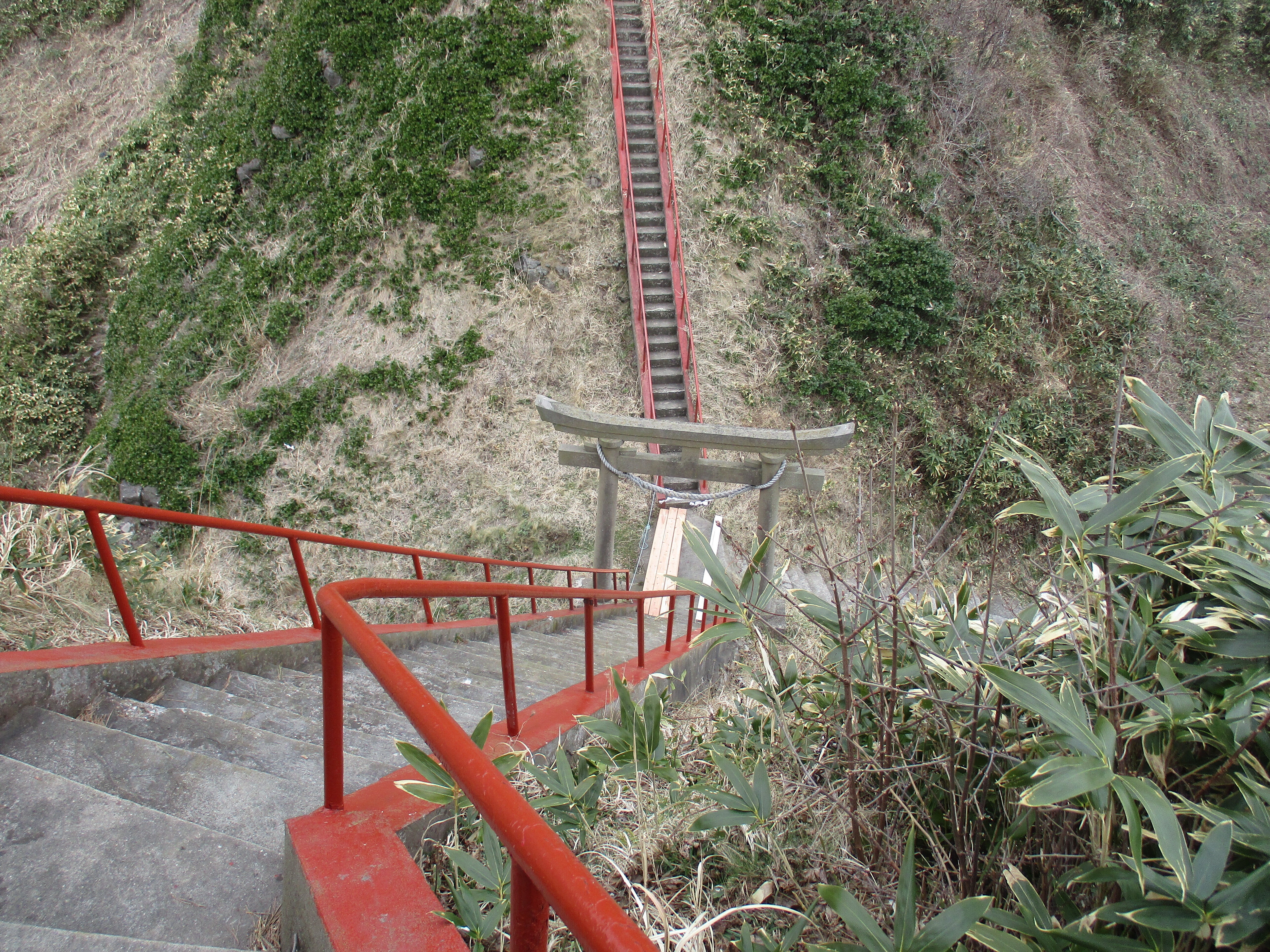 こんにちは!島の文化財の宮津弁天宮の階段です、見えています第二鳥居からは80段で宮津弁天に到着しますが40段はめまいがするほど勾配がきついです。乗り越えると楽な気持になりますよ。明上雅孝。