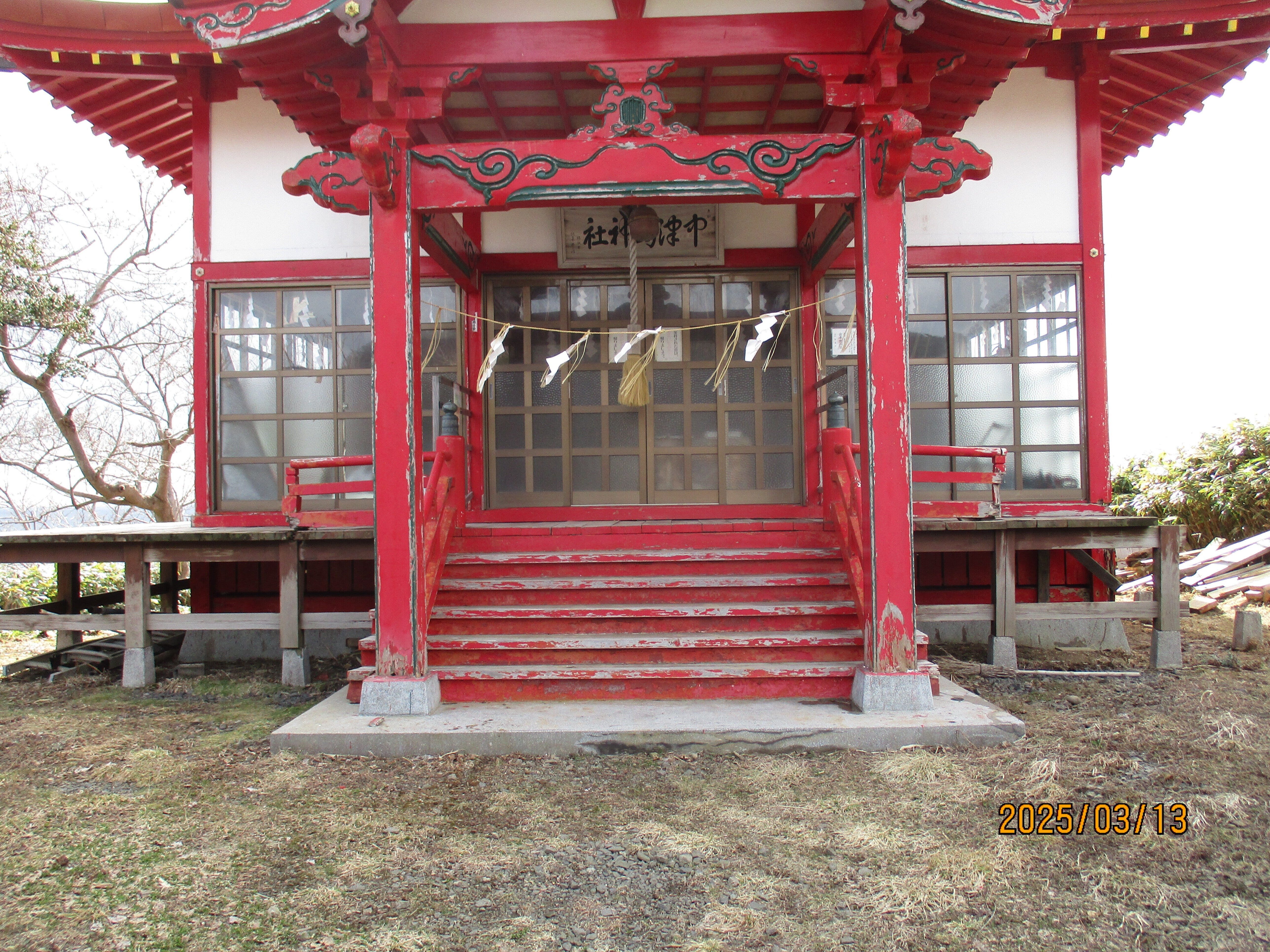 こんにちは!奥尻島の文化財の宮津弁天宮です。前から見て回廊がどちらも採れています。26日に材料を手渡し方式で120段を上げるます。勿論回廊も手すりも完全に復活しますよ、剝げていますペンキも高級なペンキで仕上げます。外壁もアルミサイディングを使用します。支援者に感謝です。お陰様で宮津弁天宮も見違えるほどの文化財になります。明上雅孝。