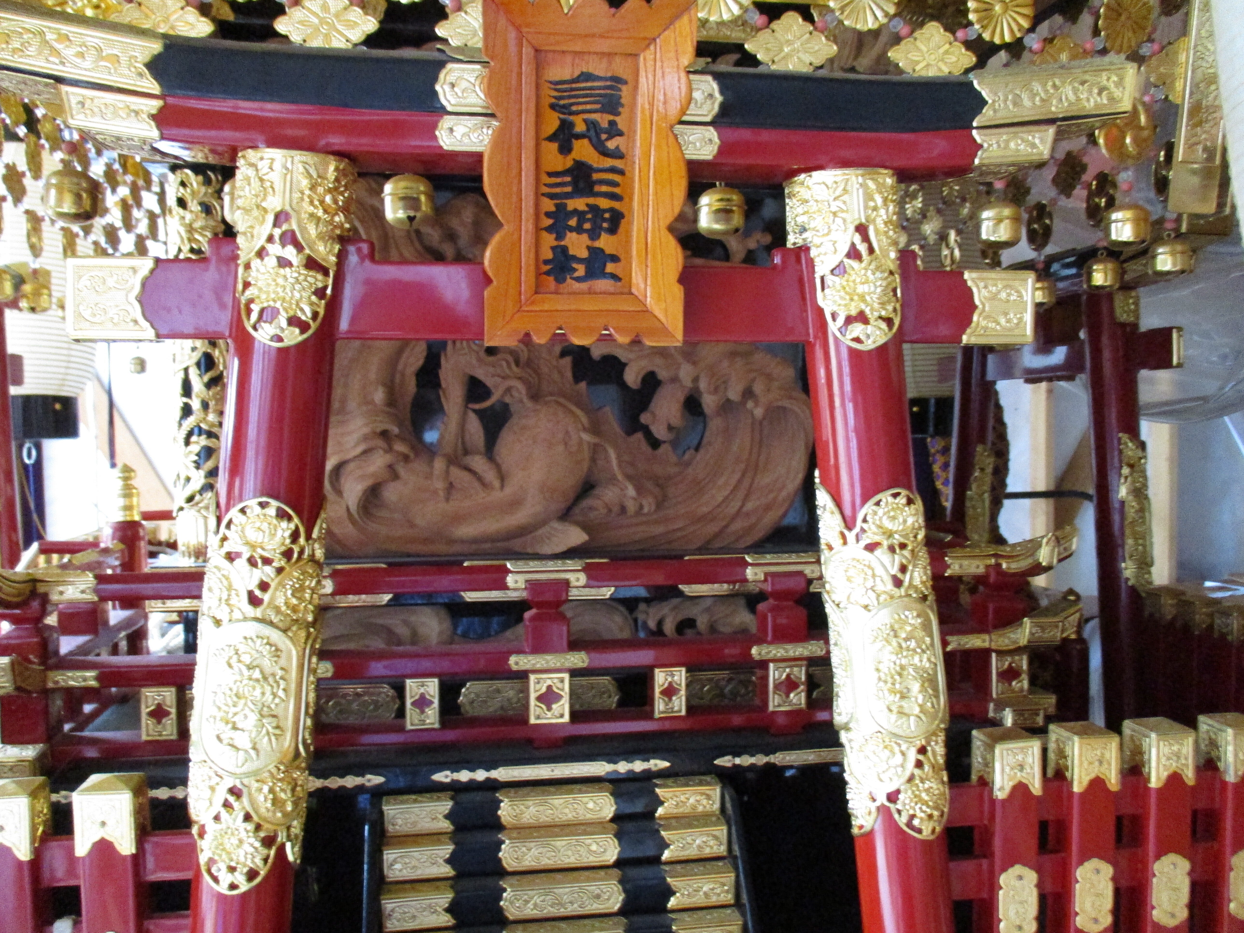 こんにちは!島は雨の8度です、青苗の事代主神社のお神輿です、平成13年に製造元の富山刑務所より買いました。台車付きで当時は850万でした、台車は人手のないときに使用します。富山の彫刻家、南部白雲氏による地震を起こさぬようにと龍がナマズを抑えています。いわゆる日本にひとつの彫刻が刻まれています。重さが600キロあり30人で担ぎます。宮津弁天宮のお神輿はこの半分ぐらいの大きさです。定期観光のコースでは目の前で見られます。明上雅孝。