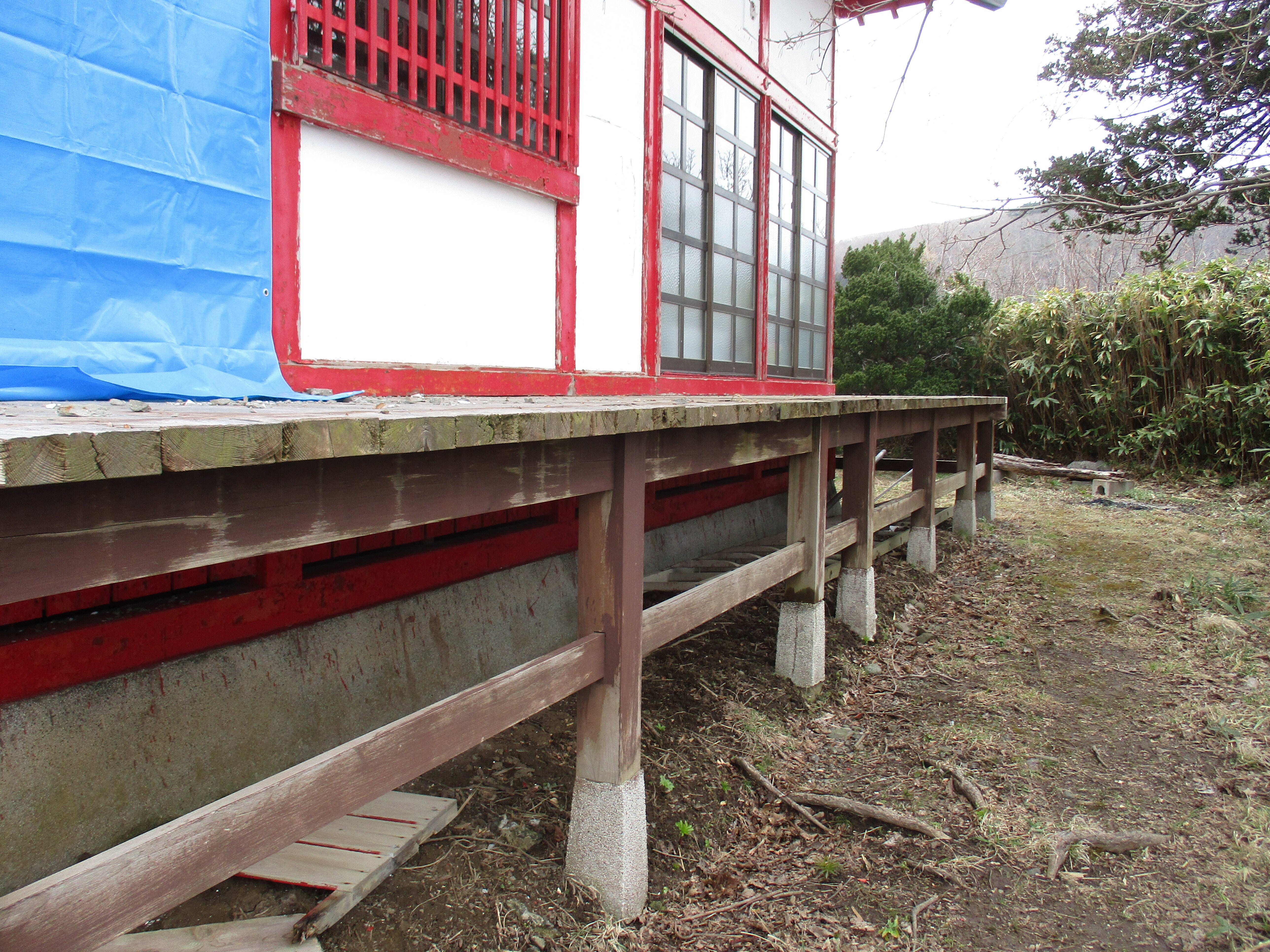 こんにちは!文化財の宮津弁天宮の本体の土台や、回廊の土台もしっかり固定されています。建設から50年は過ぎましたの解体材も最後には姿を消します。回廊の板は60本になりますが、後は現地で3枚に切ります。1本120センチの予定です。歩ける幅は。人のすれ違いは可能ですよ。回廊からの景色は絶景です。クラウドファンディングも後8日です。ウニ丸の着ぐるみの作成を助けてください。明上雅孝。