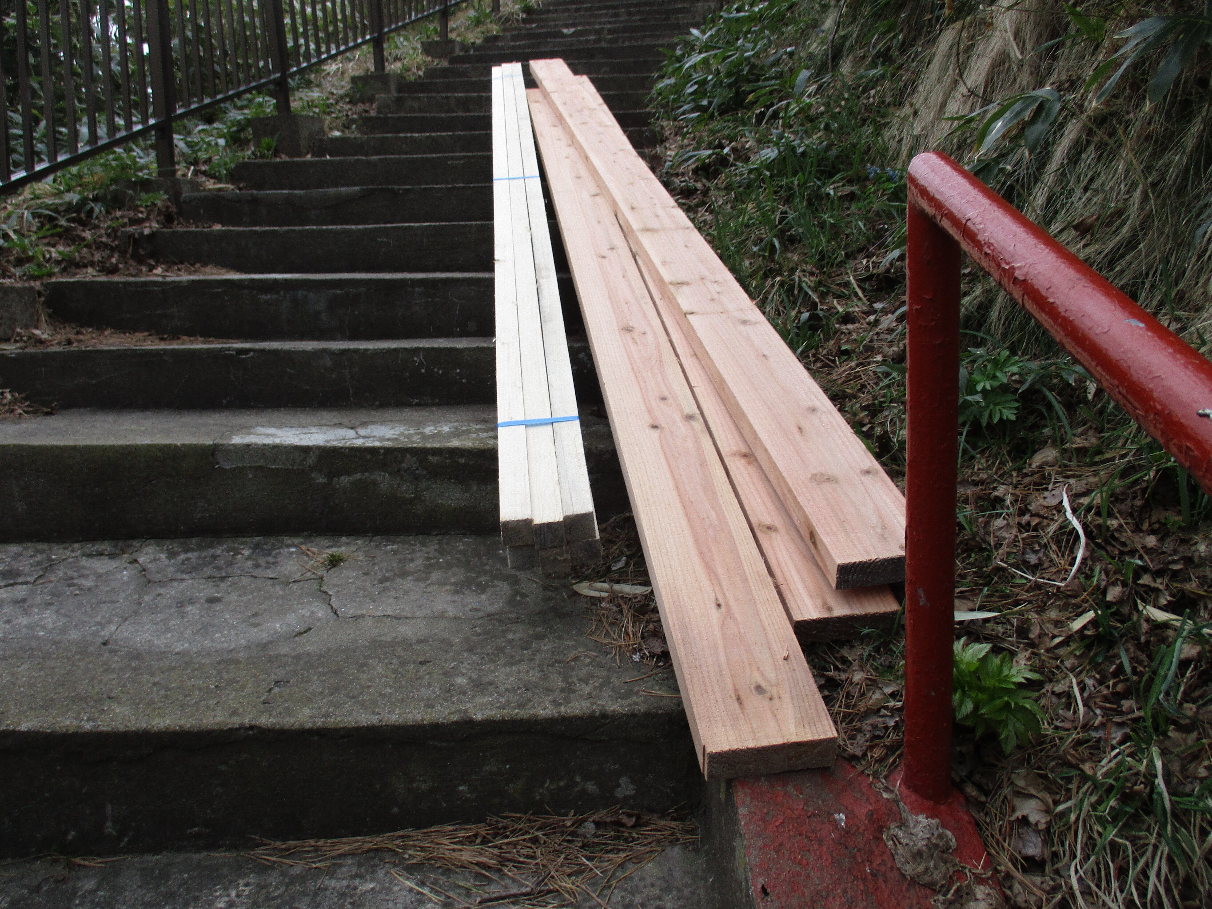 こんにちは!第二鳥居からの40段です。これからは、勾配も楽になります、神社までは後40段です。これは有志と私で2人で運びました。1,5寸角の3,6メートルですよ。勾配のきついのだけは気になります。明上雅孝。
