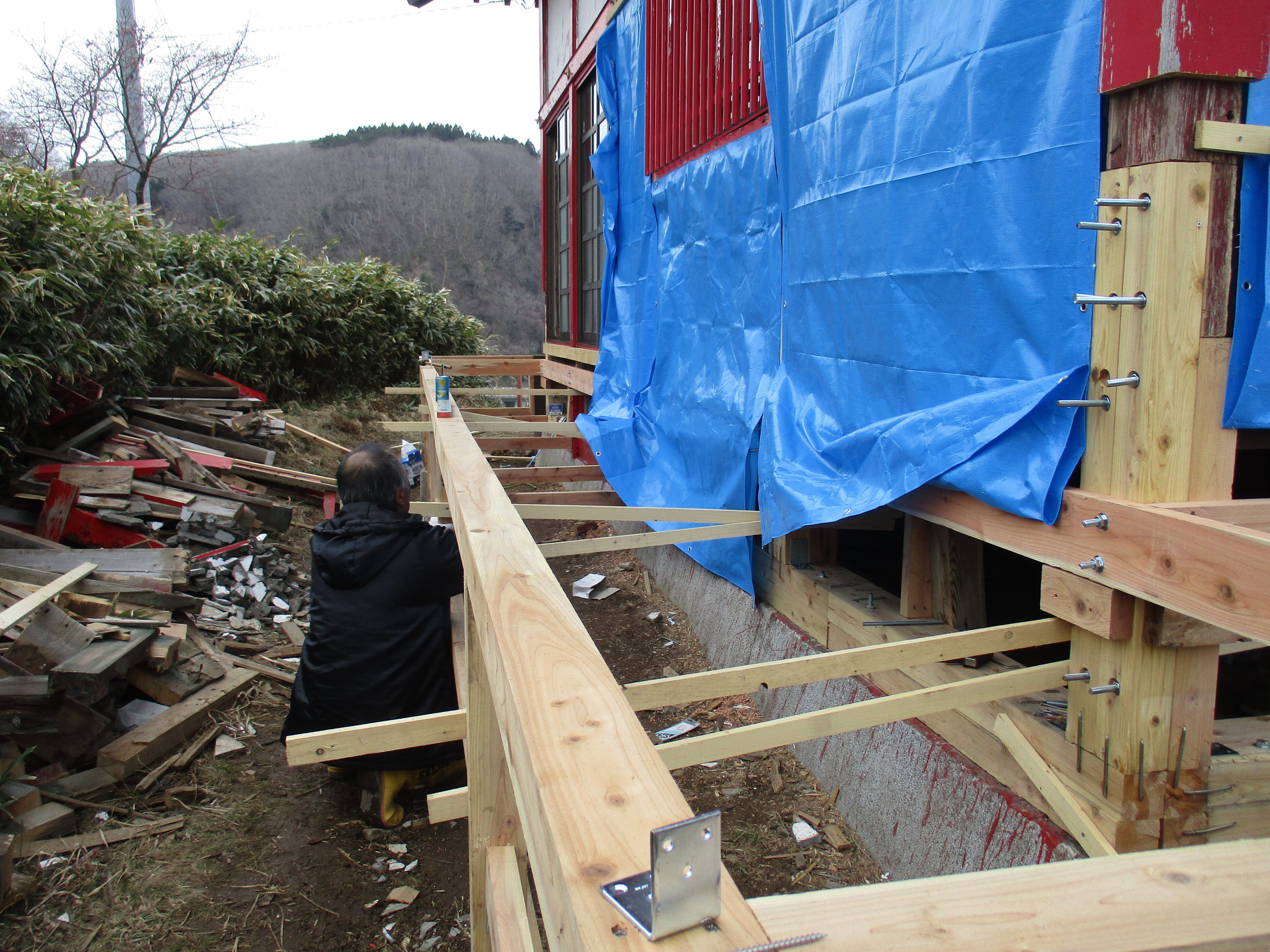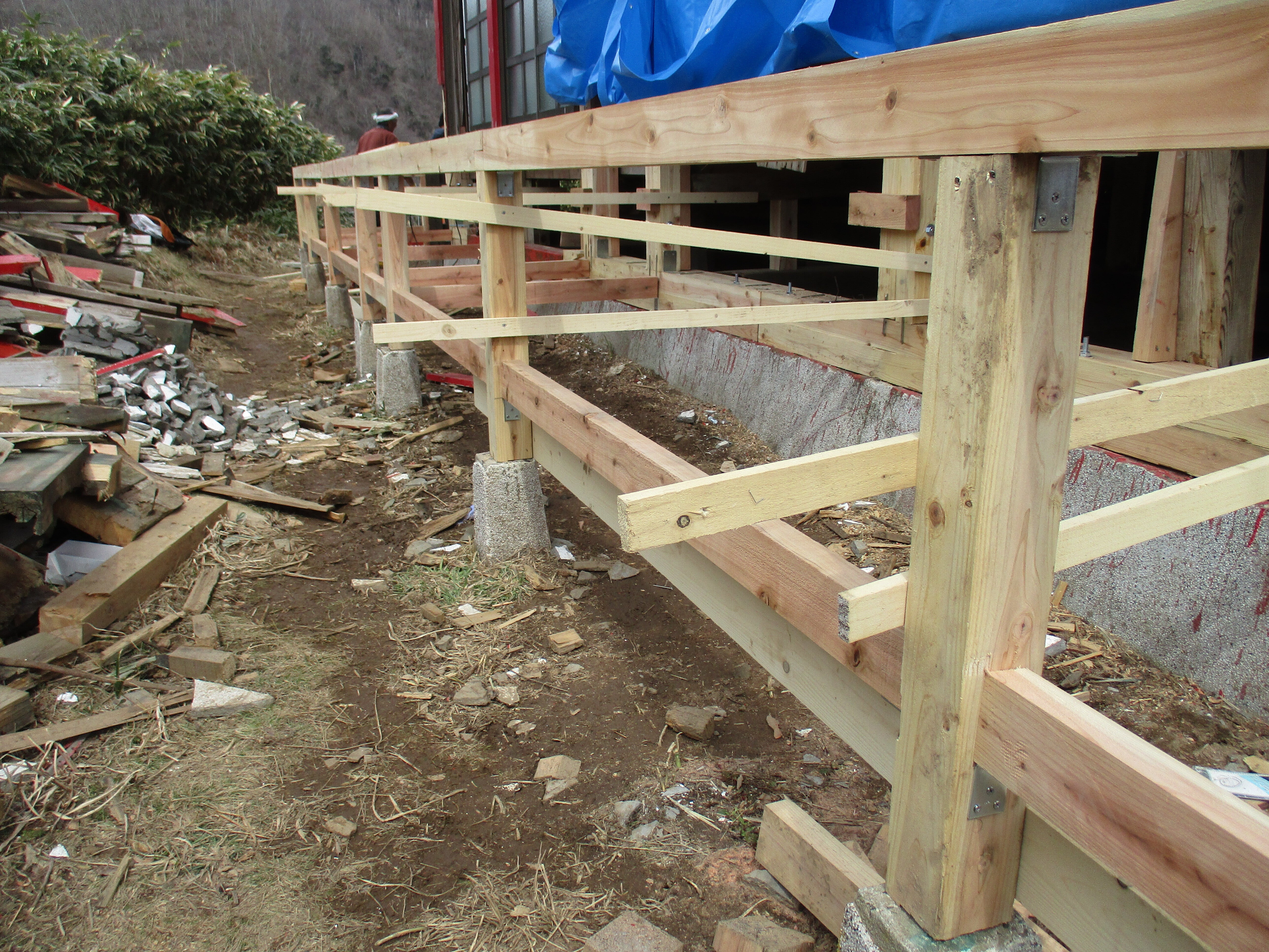 こんにちは!今日も有志の二人が工事をしています。島の文化財の宮津弁天宮を。本体の土台も終えました。回廊の土台も終えました、この後は回廊の板をはります。手渡し方式で第一鳥居から120段を上げる予定です。今度は60本の予定です。外壁のアルミサイディングも手渡し方式で第一鳥居から120段を上げる予定です。解体してある材料は手渡しで上げた後に今度は手渡しで下げれるかな、と考えています。最後は廃棄物の処理です。明上雅孝。