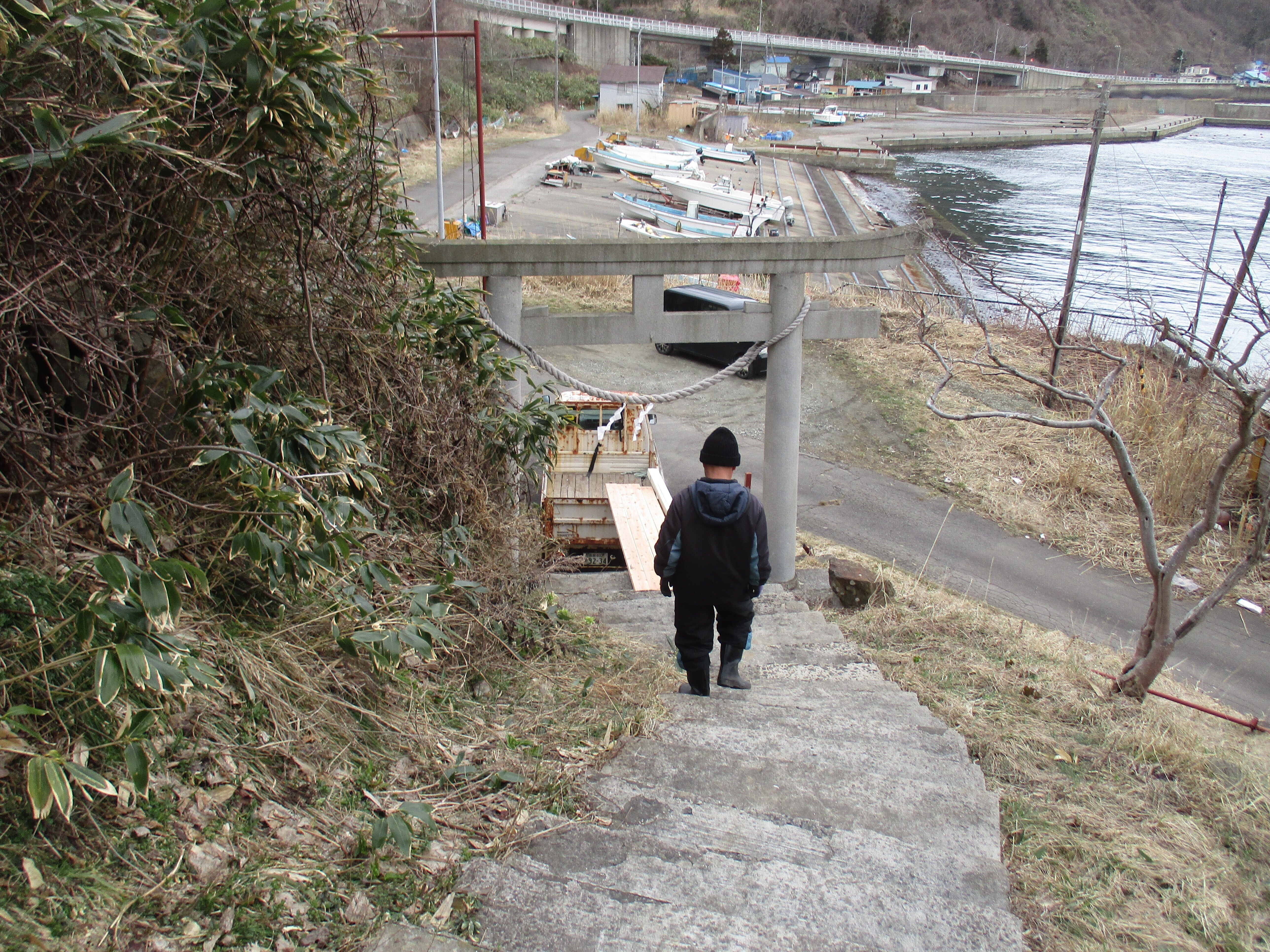 こんにちは!文化財の宮津弁天宮に上がるのに宮津港から第一鳥居から第二鳥居までの40段です。ここは緩やかな40段です。第二鳥居からの80段の半分が勾配がきついです。手すりを持ちながら材料を2人で持ち上げました。この時の材料は3,6メートルでしたが少し厚さがありましたので。明上雅孝。