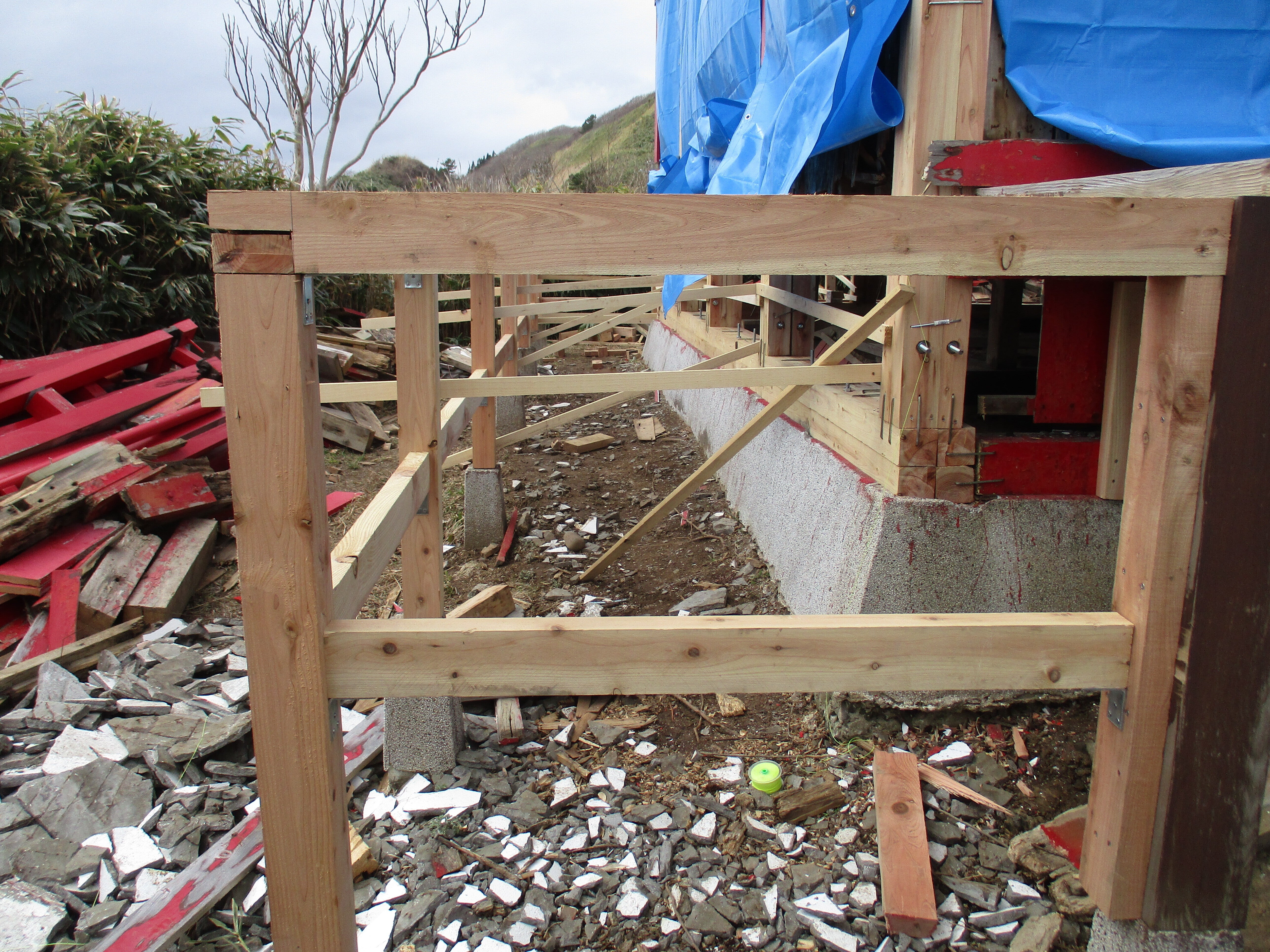 こんにちは!文化財の宮津弁天宮の本体の土台や、壁、回廊の土台もしっかりと固定されました、この後は回廊の板をはります、そして壁のアルミサイディングをはります、古い材料のかたずけも下まで下ろします。これからは120段を手渡し方式でクリアーする予定です。完成が楽しみです。明上雅孝。