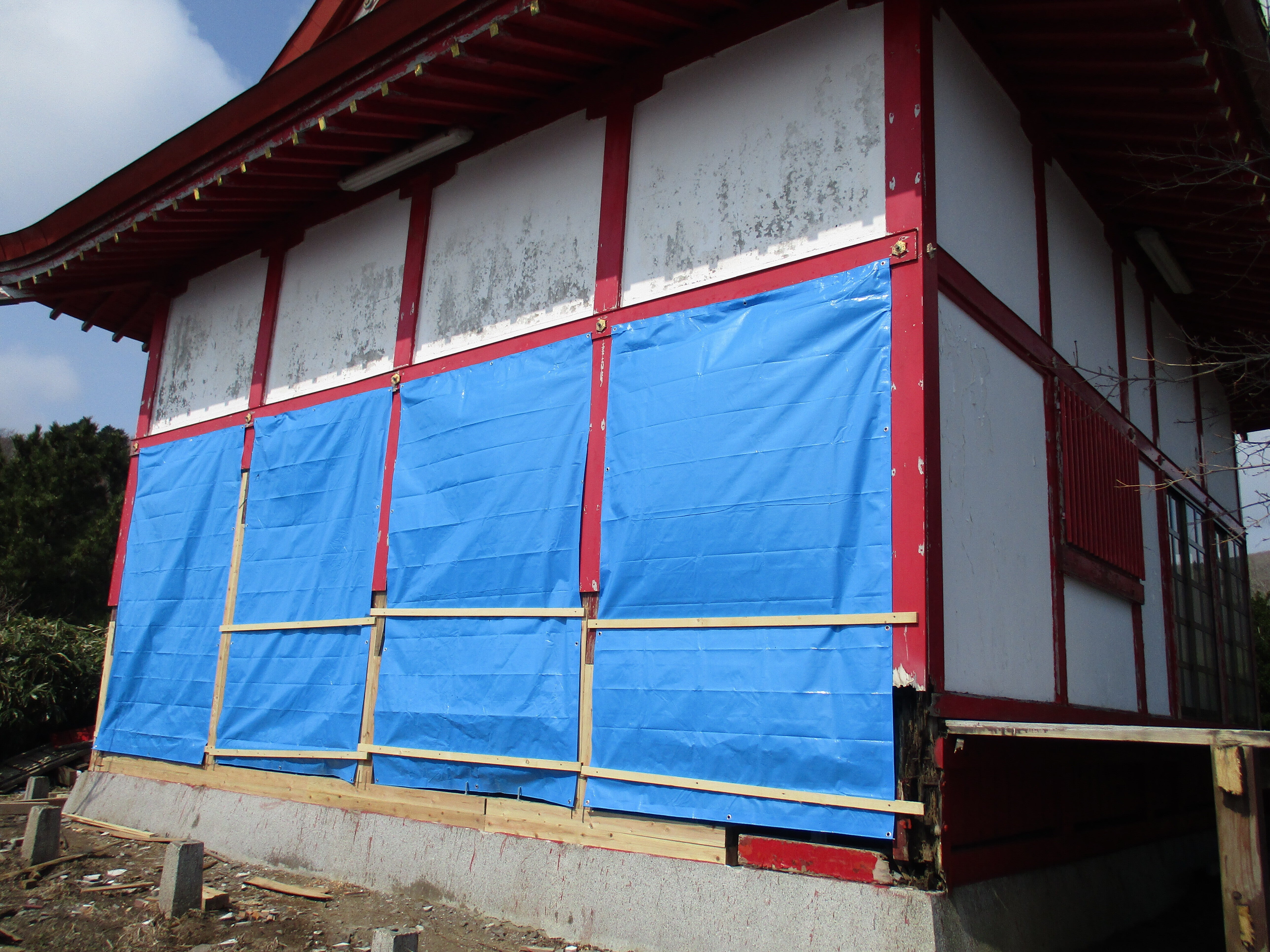 こんにちは!島の文化財の宮津弁天宮の後ろ姿です、手前のブロックが回廊の基礎の土台です。下には遺跡があり掘れません、今は3寸角材が設置されています。シートの後は軽いアルミサイディングを予定しております。発注を終えています。地元です、明上雅孝。建設から50年が過ぎました。