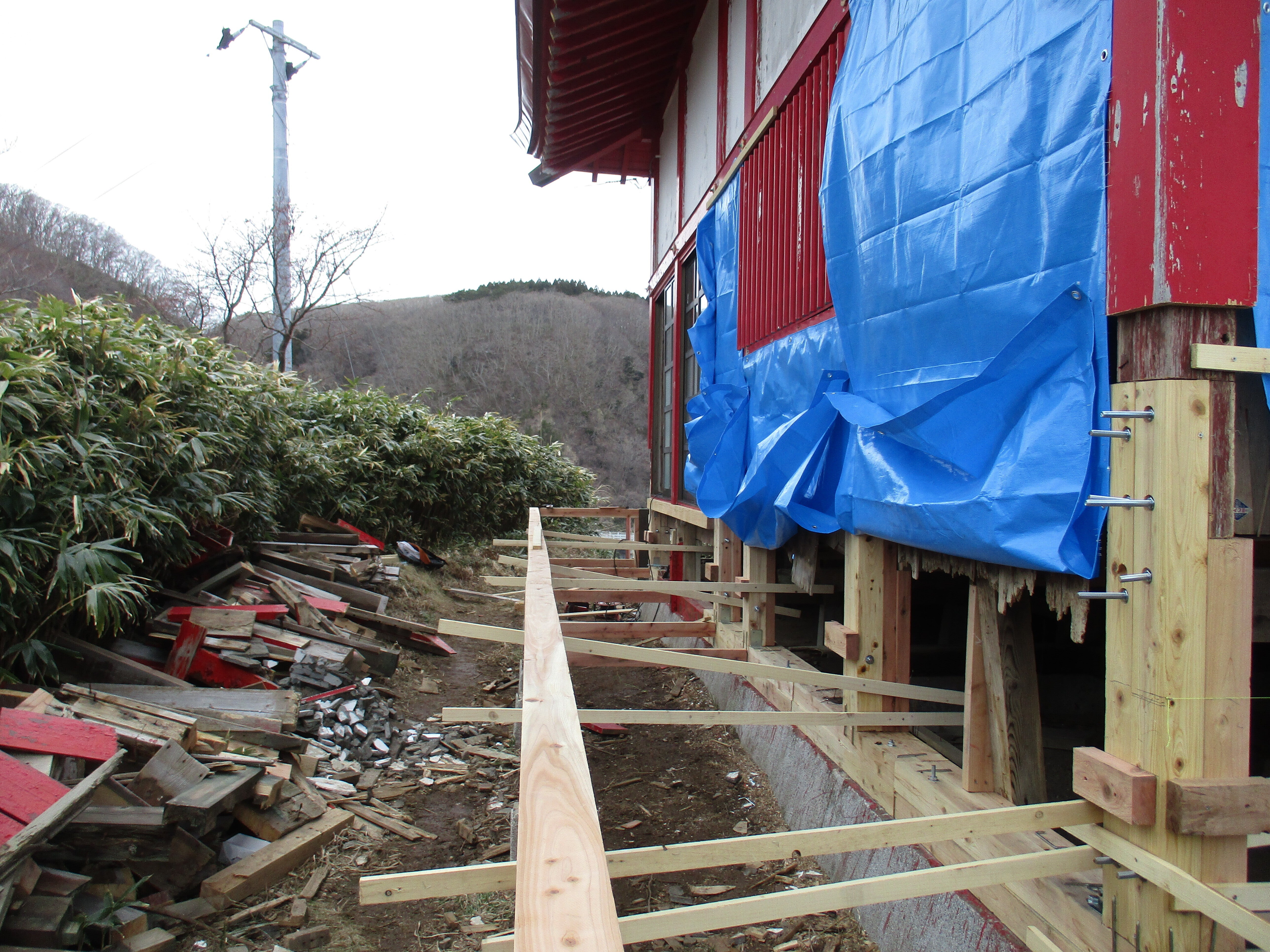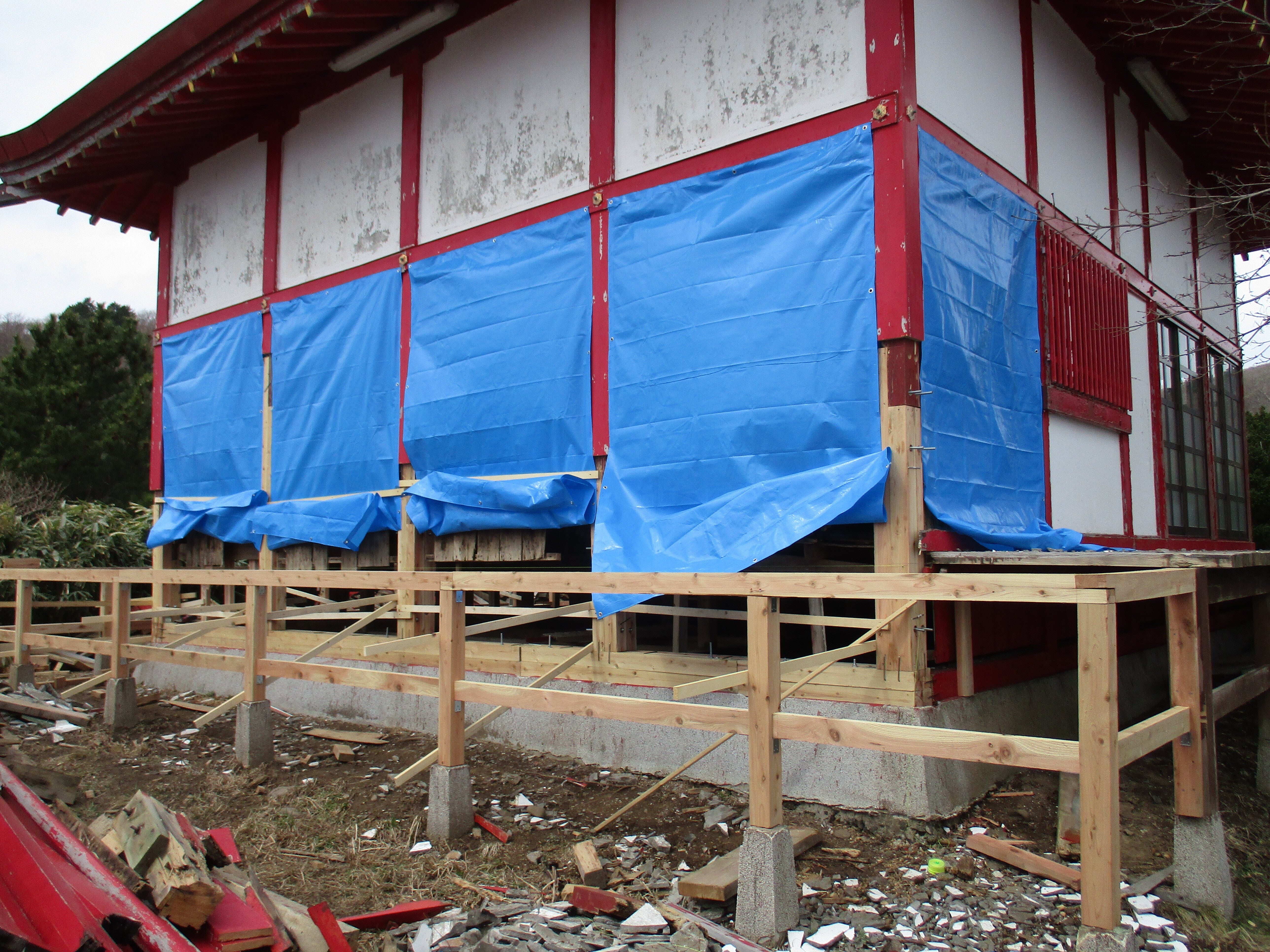 今晩は、文化財の宮津弁天宮です。本体の土台は、3寸角を4本で金具でしっかり止めました。4寸角でしたので。回廊の土台は3寸角です。ブロックの下は遺跡があるので掘れません。ブルシートに貼るアルミサイディング45枚は今日発注を終えました。有志は心強いですね。支援者に感謝です。ここまで来ました。この後は回廊の板を70本を手渡し方式で上げる予定です。090-5984-1384,明上雅孝。ウニ丸ぬいぐるみのご支援をよろしくお願いいたします。