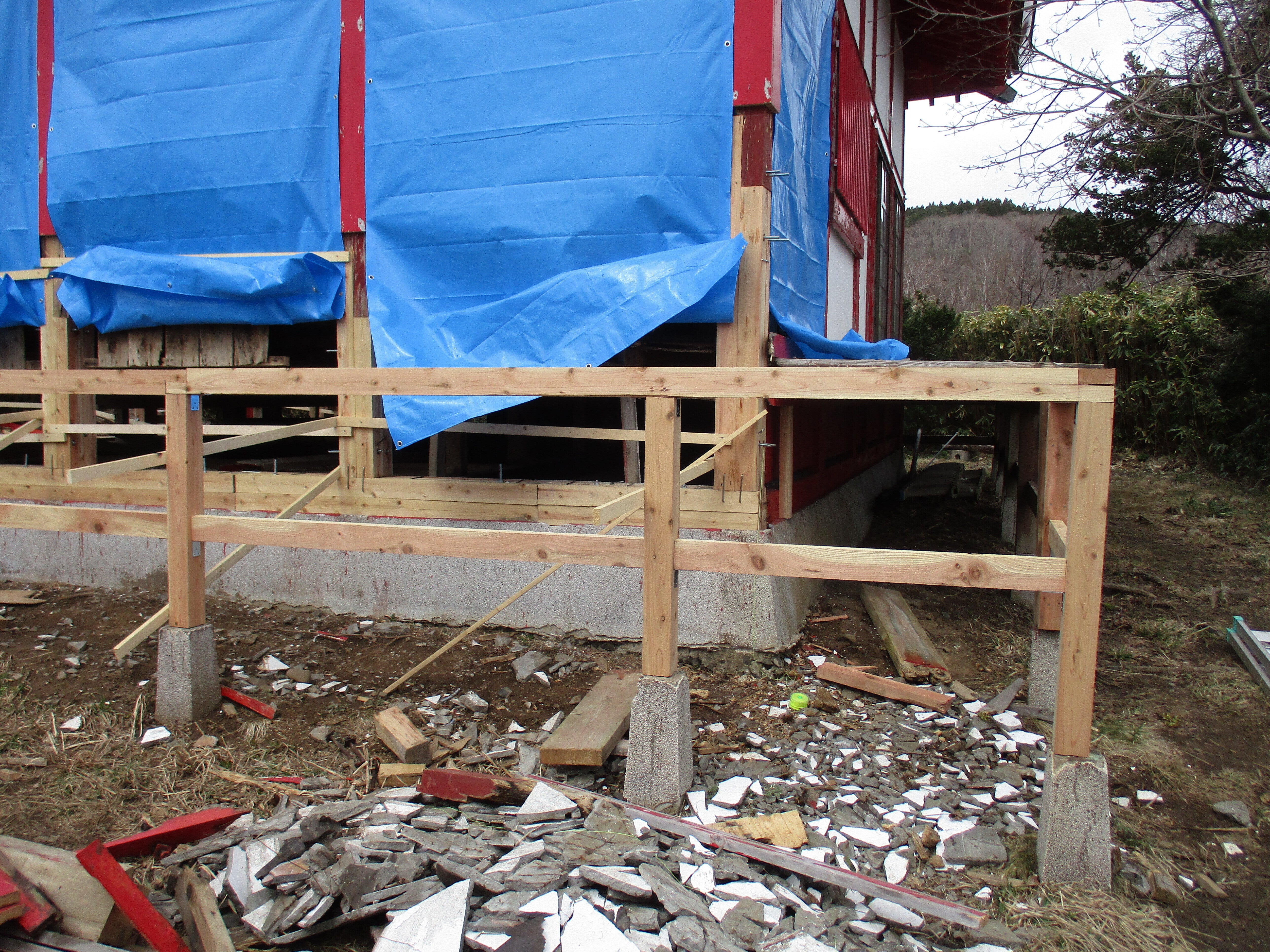 こんにちは!島の文化財の宮津弁天宮の後ろを今日映しました。ブロックの下は遺跡があるので上からの工事です。3寸角の材料からスタートしました。本体は土台が4寸でしたので、3寸角を4本合わせて金具でしっかり固定しました。これから回廊の板をはり、外壁に手を付ける予定です。今日の有志3人の打ち合わせでした。支援者のおかげでここまで来ました。感謝、感謝、感謝、090-5984-1384、明上雅孝。