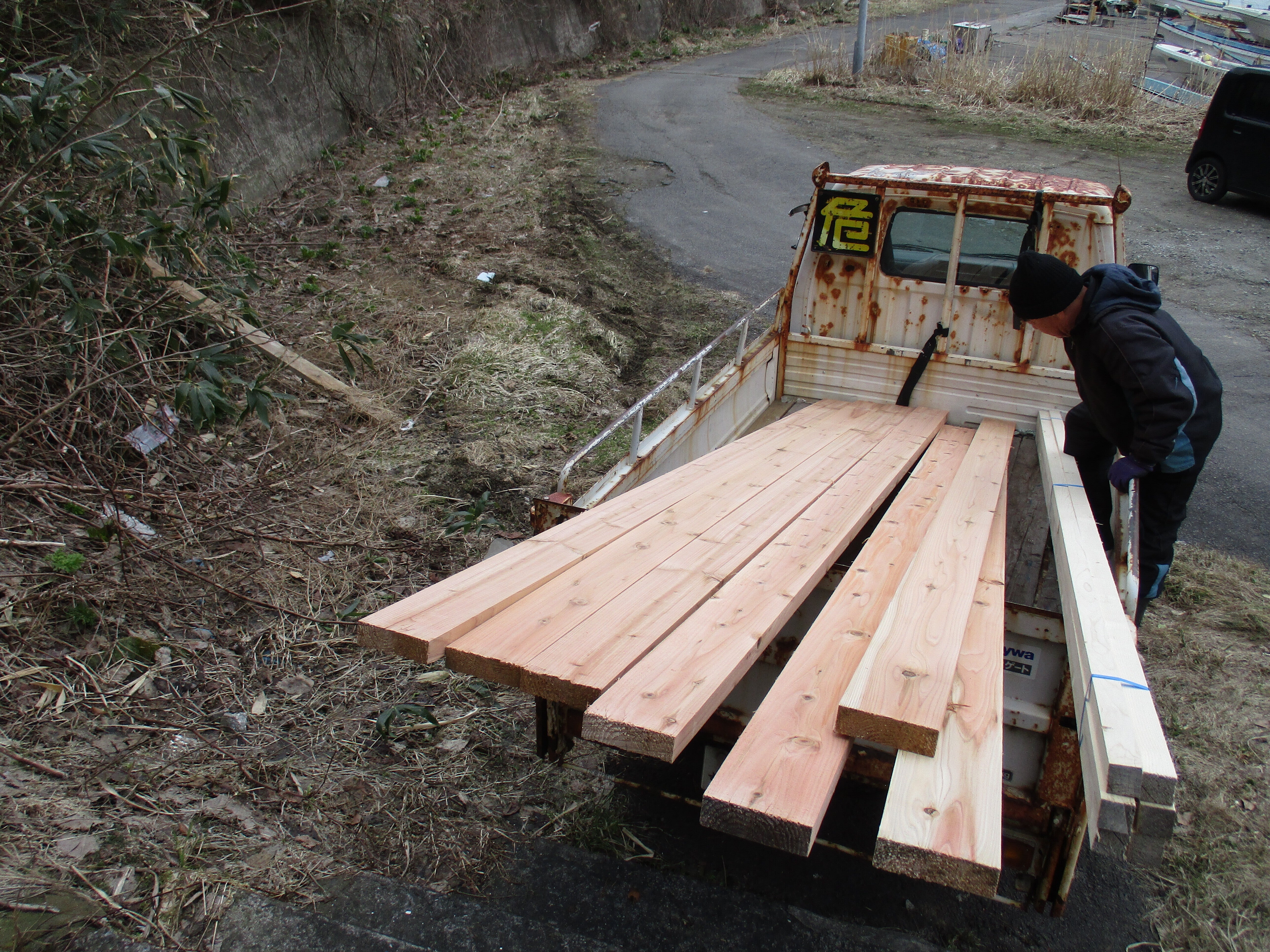 こんにちは!昨日の材料です。1,5寸の3,6メートルを7本とたるき6本です。有志の二人にはきついですよ。第一鳥居から120段を10回休みました。息切れしました、やはり15人の手渡し方式は最高です、人が動かないので体力が持ちますよ。この後の回廊の板などは手渡し方式です。支援者のおかげで文化財の宮津弁天宮に登れます。これもご縁ですね。支援者に感謝です。今のお願いはウニ丸の着ぐるみの購入の支援のお願いです。20年も使い汚れすぎました、18日までのクラウドファンディングを実施しています。力をお貸しください。75歳の高齢者に。明上雅孝。