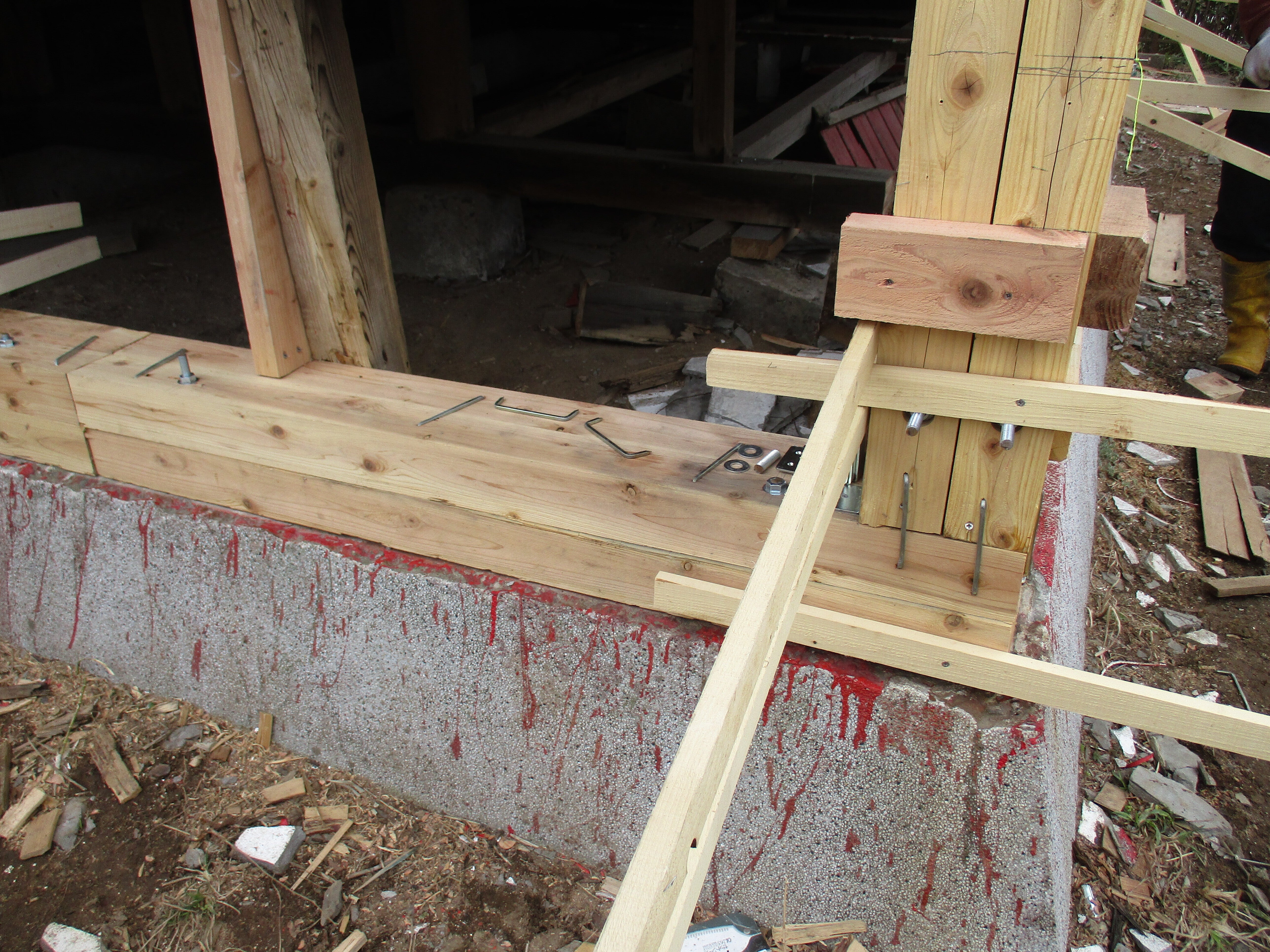 こんにちは!今日の出来事です。材料を上げた際に映してきました。本体の土台は、4寸角でしたので、3寸角を4本合わせました。頑丈にしました。金具も固定しています。有志で頑張っています。明上雅孝。