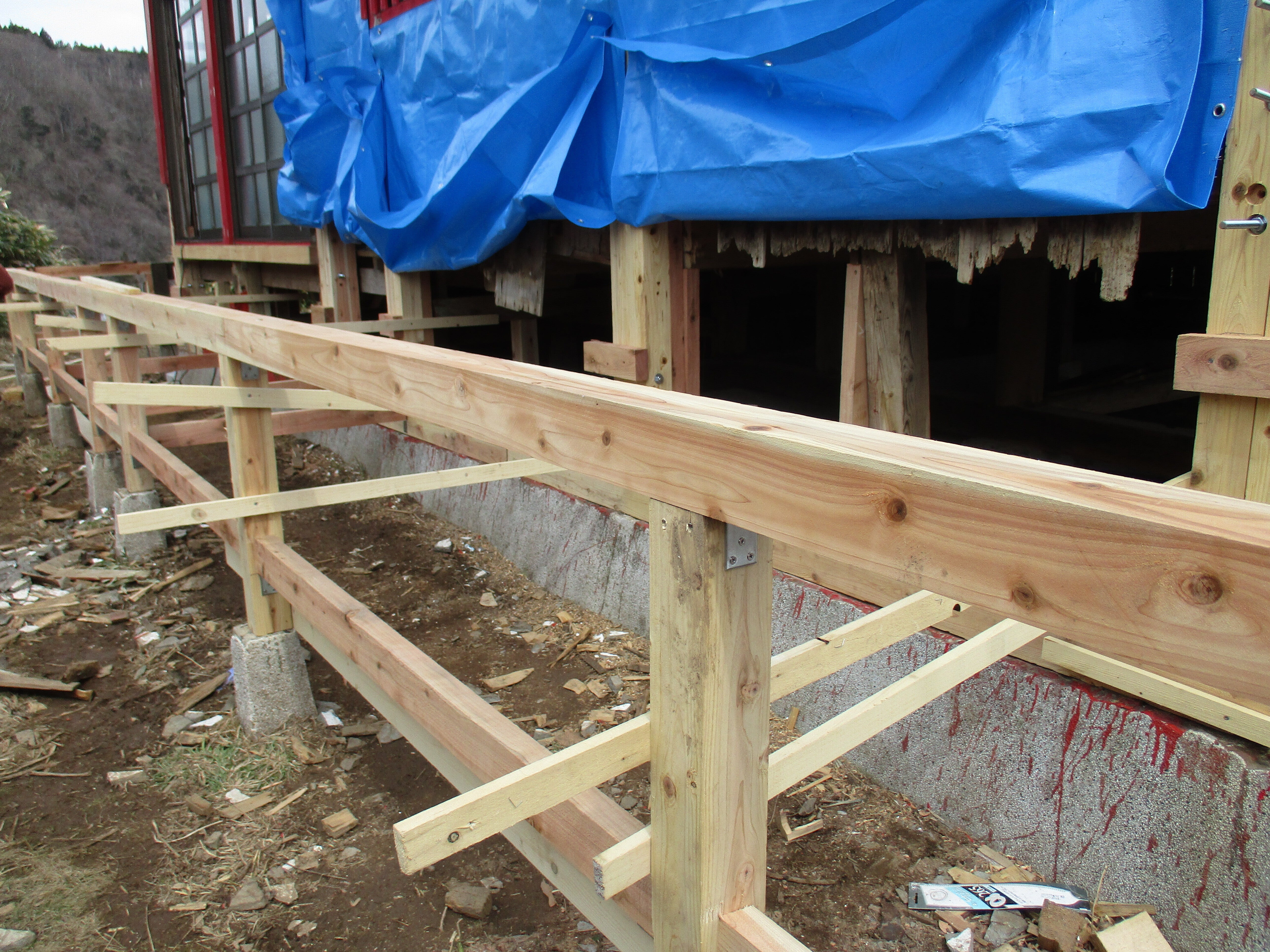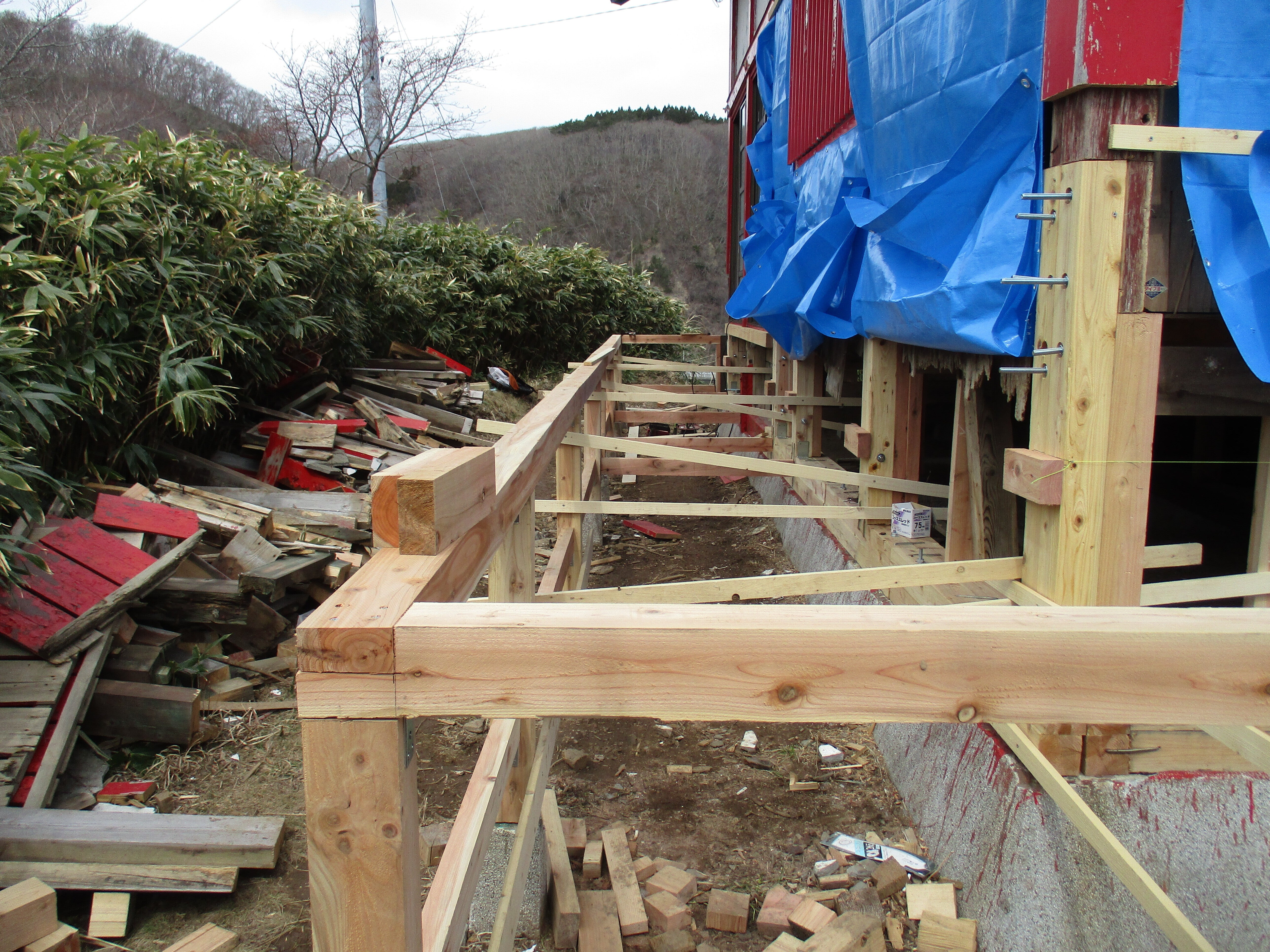 こんにちは!島の文化財の宮津弁天宮は本体の土台は4寸角でした。3寸角を4本合わせ、金具でしっかり固定しました。回廊の土台のブロックには3寸角の材料です。回廊には手すりを付けます。歩ける幅は120センチのようです。絶景が見渡せます。明上雅孝。