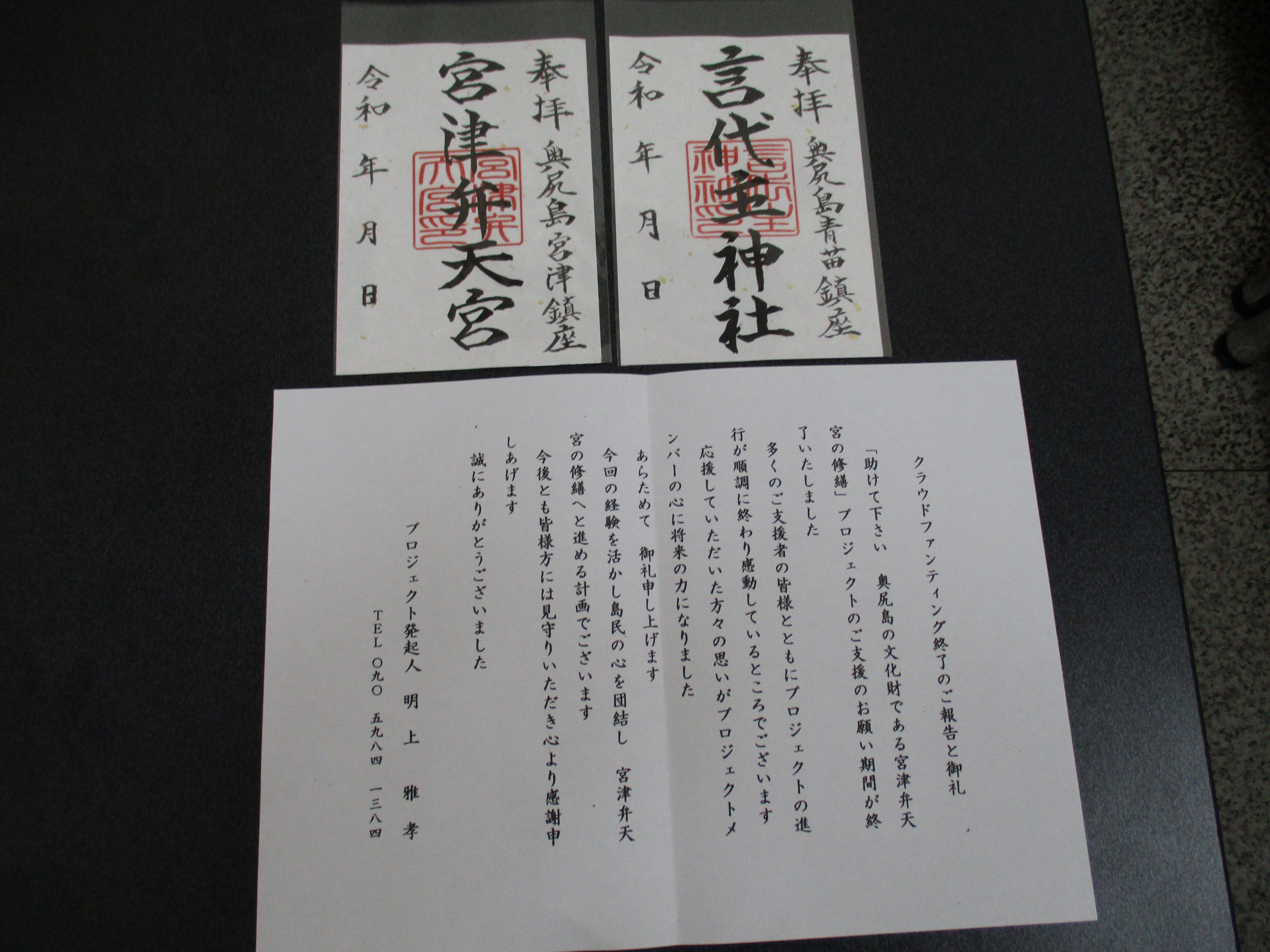こんにちは!事代主神社と宮津弁天宮の金粉の手帳型の御朱印です。有志で初めて作りました。来島時には各1枚は初穂料にて500円にて購入されています。今は島の神社は維持に大変です。諦めずに頑張ります。明上雅孝。