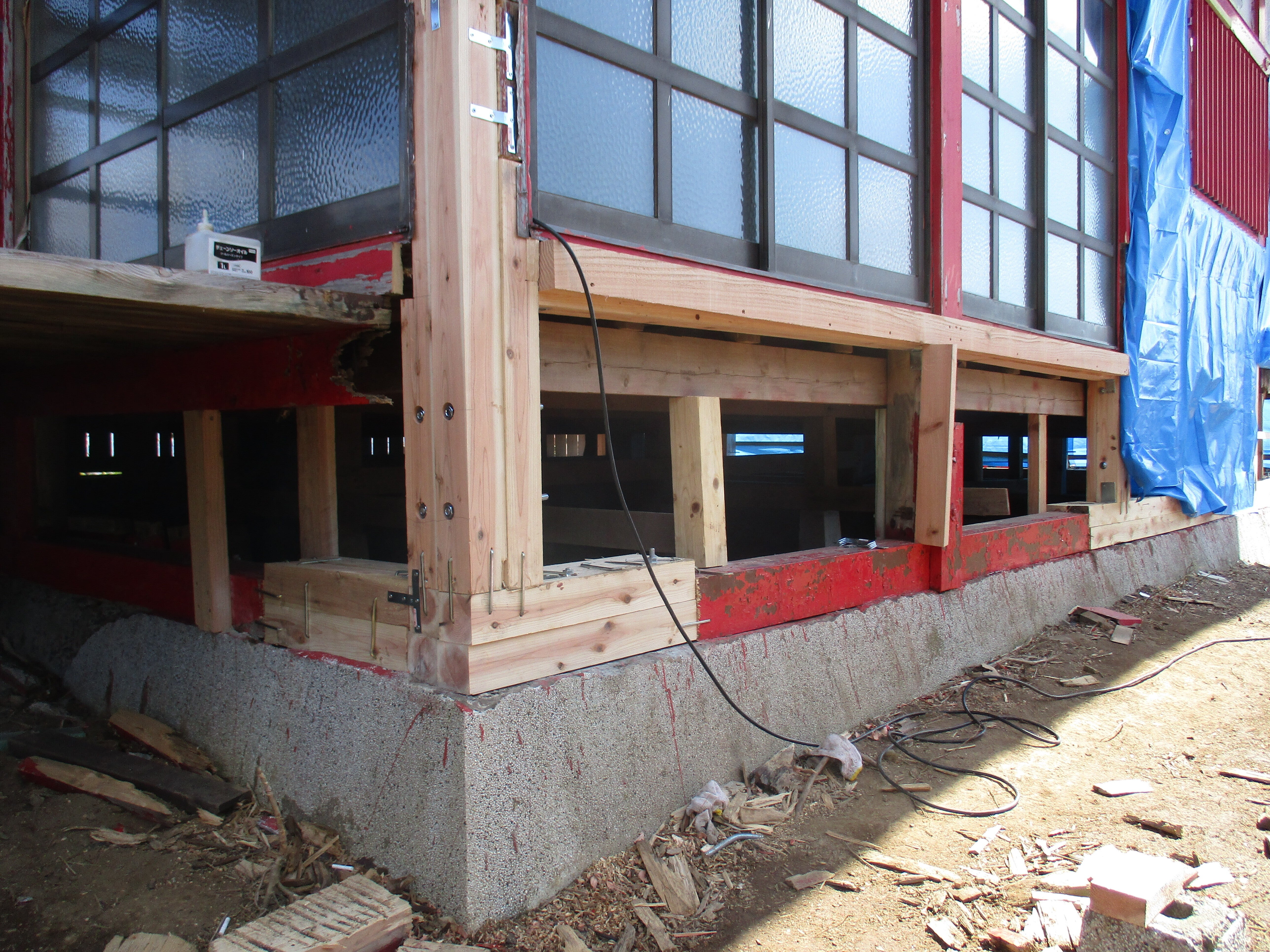 こんにちは!文化財の宮津弁天宮の修理の様子ですが私にもわかるように土台は3寸角を2本にし、金具やつかみやドリルでの工事でしっかり止めています。回廊の土台のブロックの上は3寸角と言っていました。ブロックの下は遺跡のために掘れませんよ。4月からの工事は土、日、祭日のみの工事になります。みんなの仕事の関係です。諦めずに頑張ります。明上雅孝。
