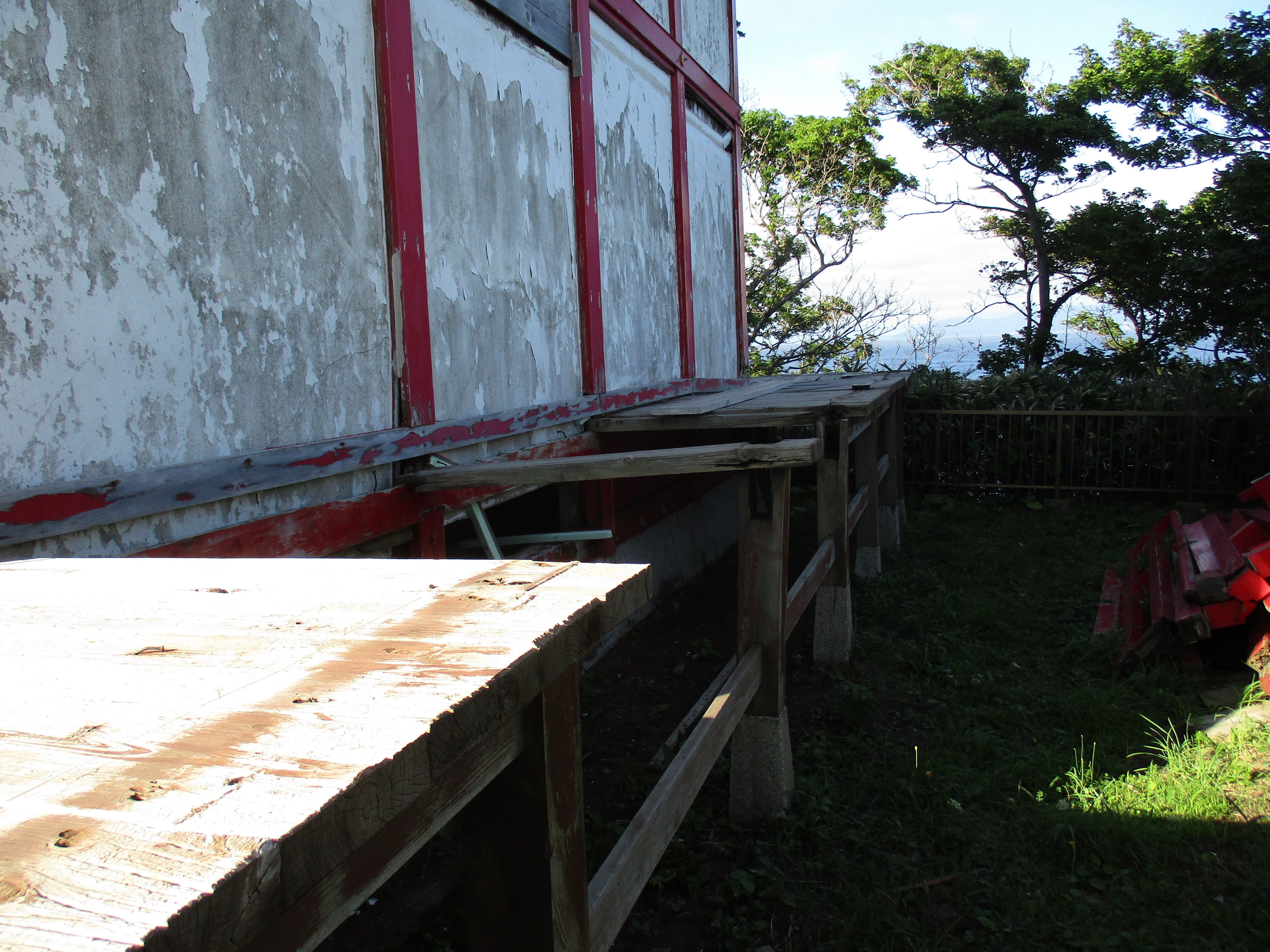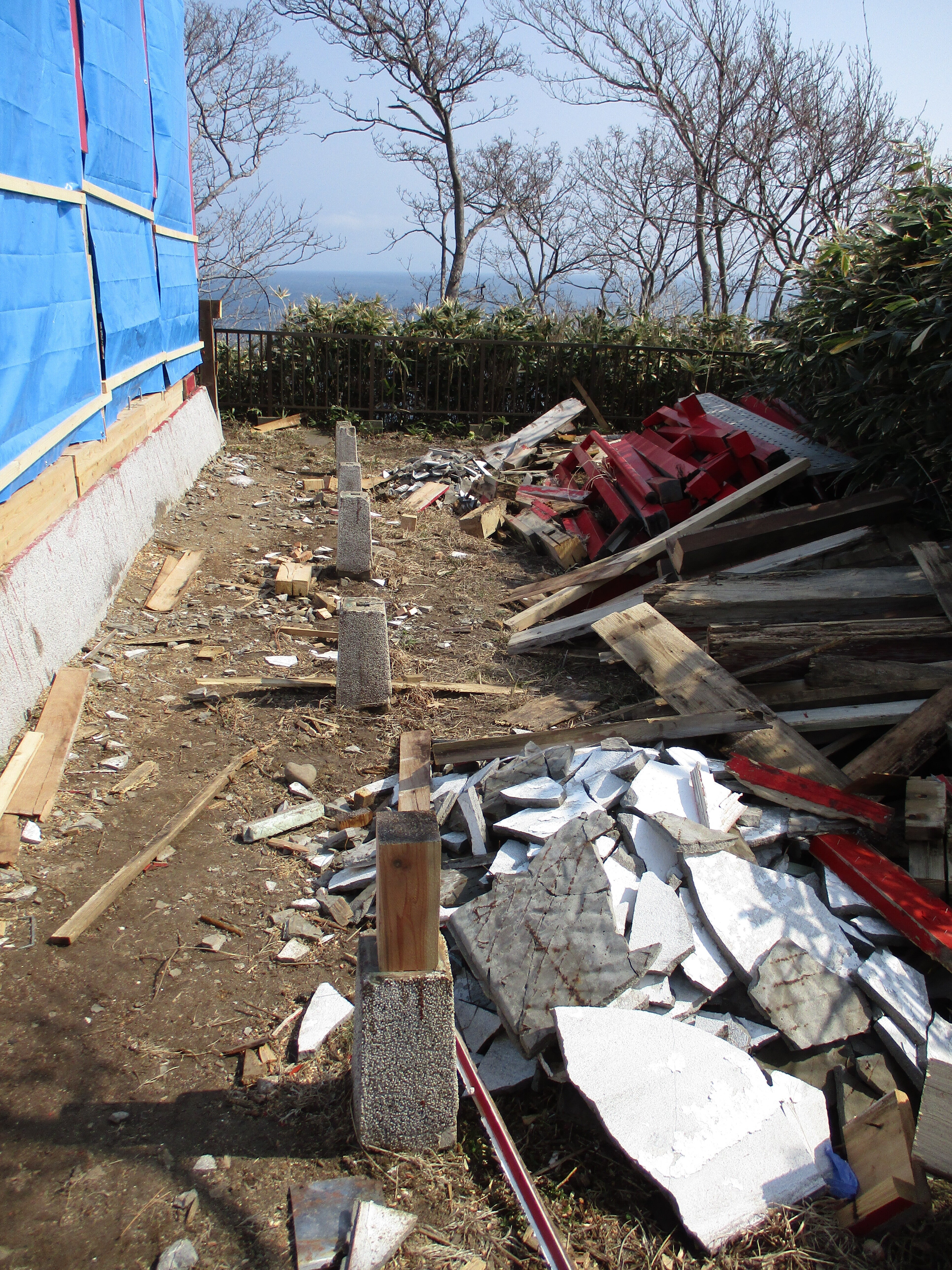 こんにちは!宮津弁天宮の回廊を解体の後です、見えていますブロックに3寸の角材を固定し手すりのついた厚さ5センチの回廊を作ります。幅が120センチなので人はすれ違えます。回廊から見える景色は絶景の評判です。明上雅孝。